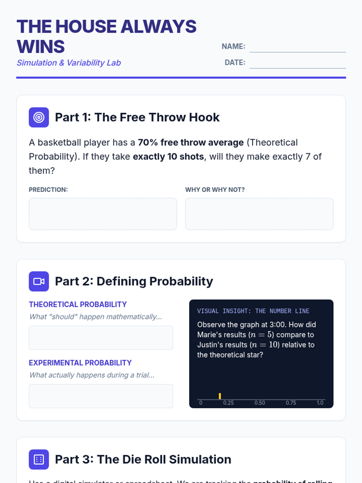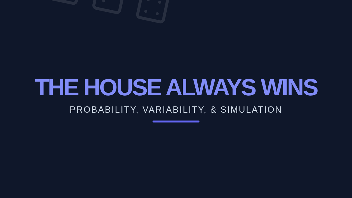 A high school math lesson exploring the gap between theoretical and experimental probability through a die-roll simulation. Students investigate the Law of Large Numbers and analyze why variability decreases as sample sizes increase, concluding with a real-world look at casino economics.