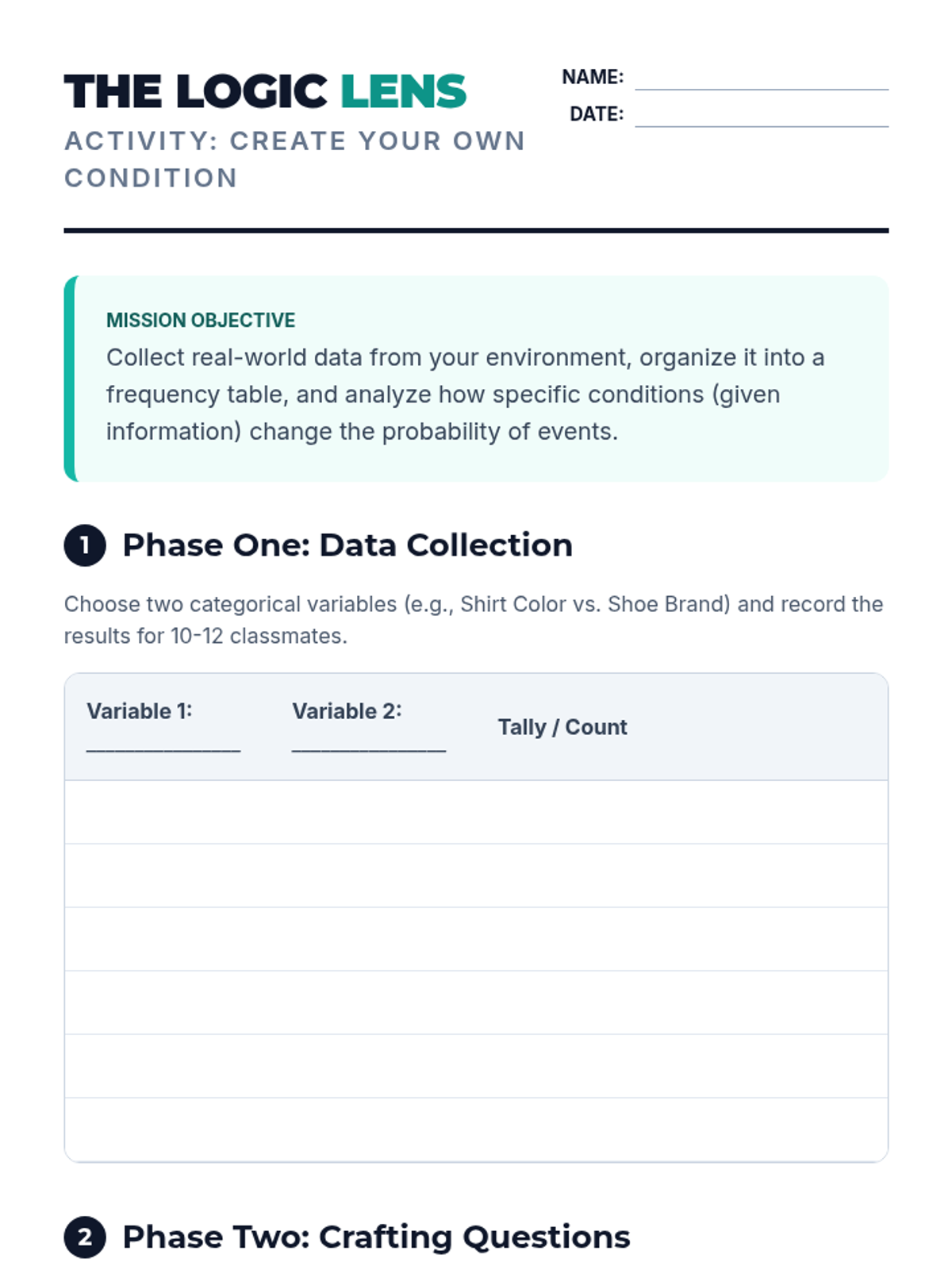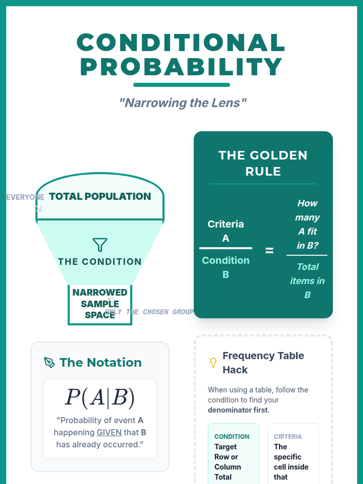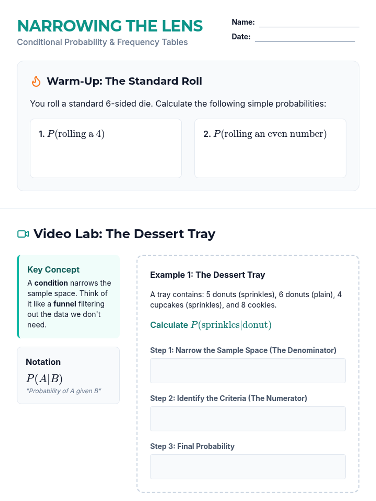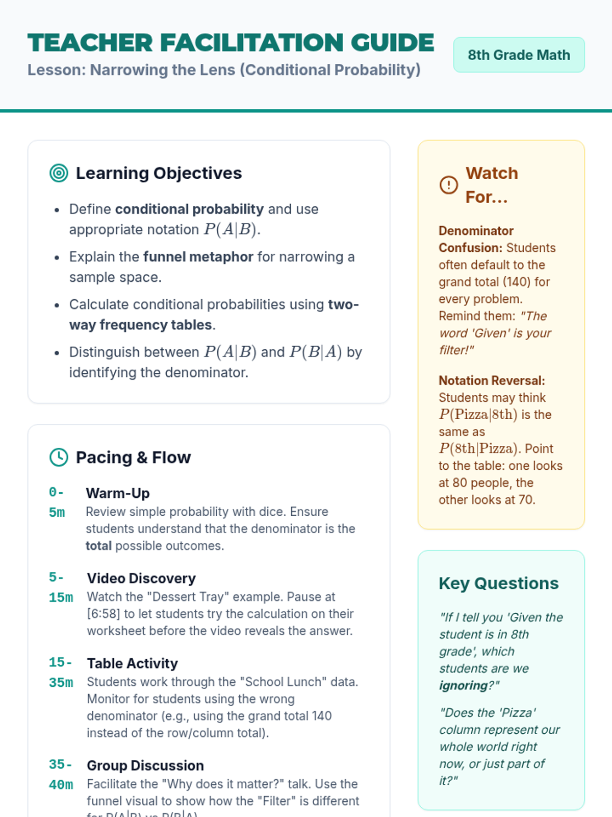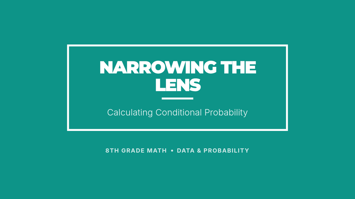 Students will learn how to calculate conditional probability using frequency tables, using the metaphor of a 'funnel' to understand how conditions narrow the sample space. The lesson includes a video analysis, a two-way table activity on school lunch preferences, and a visual extension.