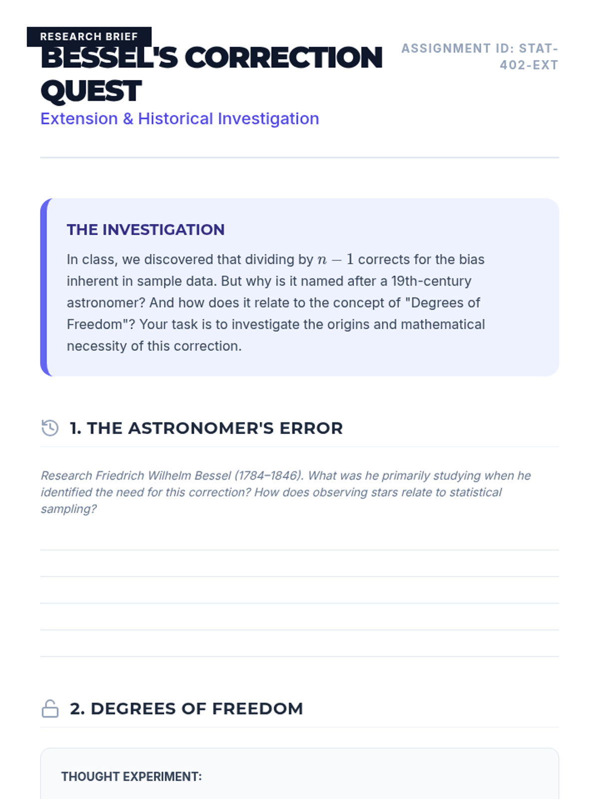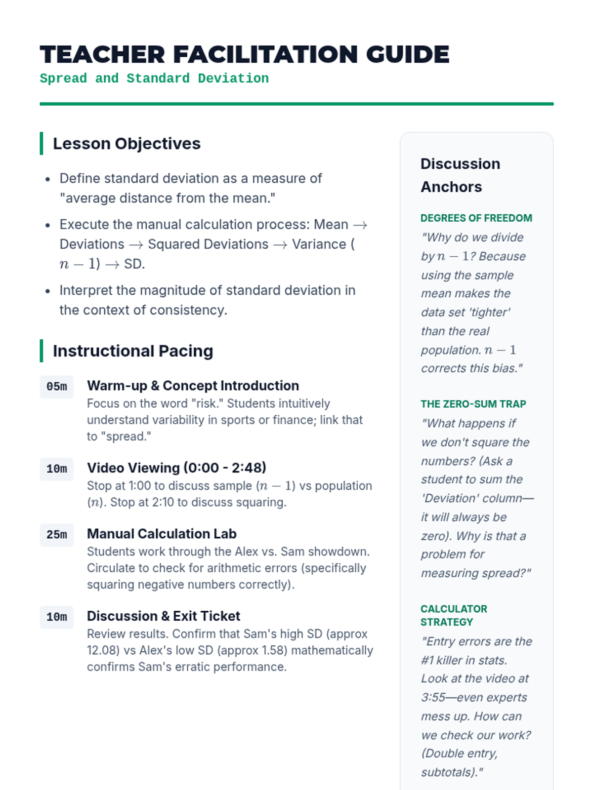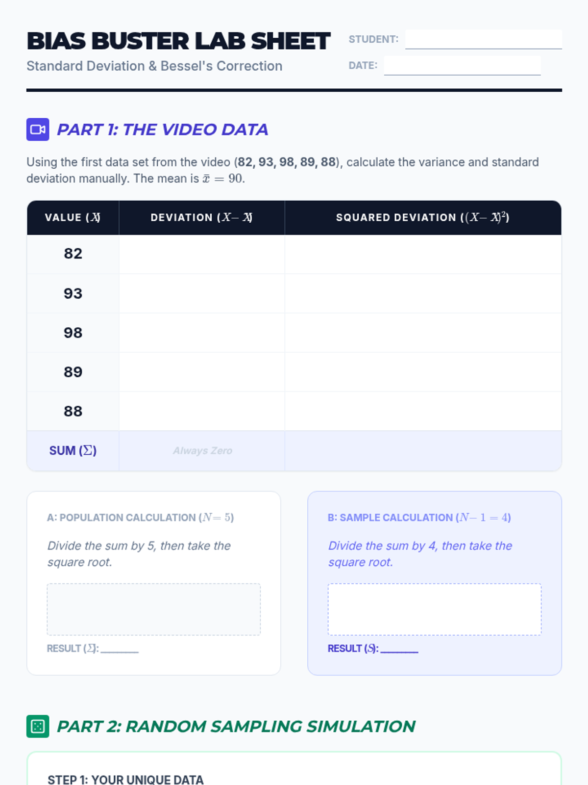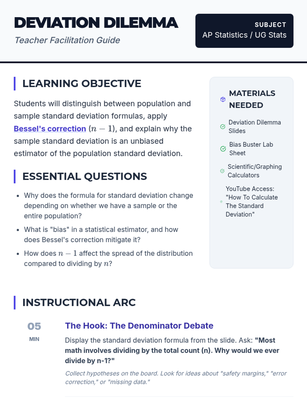 This lesson explores the conceptual and mathematical differences between population and sample standard deviation, focusing on the derivation and application of Bessel's correction (n-1) to ensure unbiased estimation. Students will analyze video demonstrations, perform comparative calculations, and conduct a sampling simulation to witness bias in action.