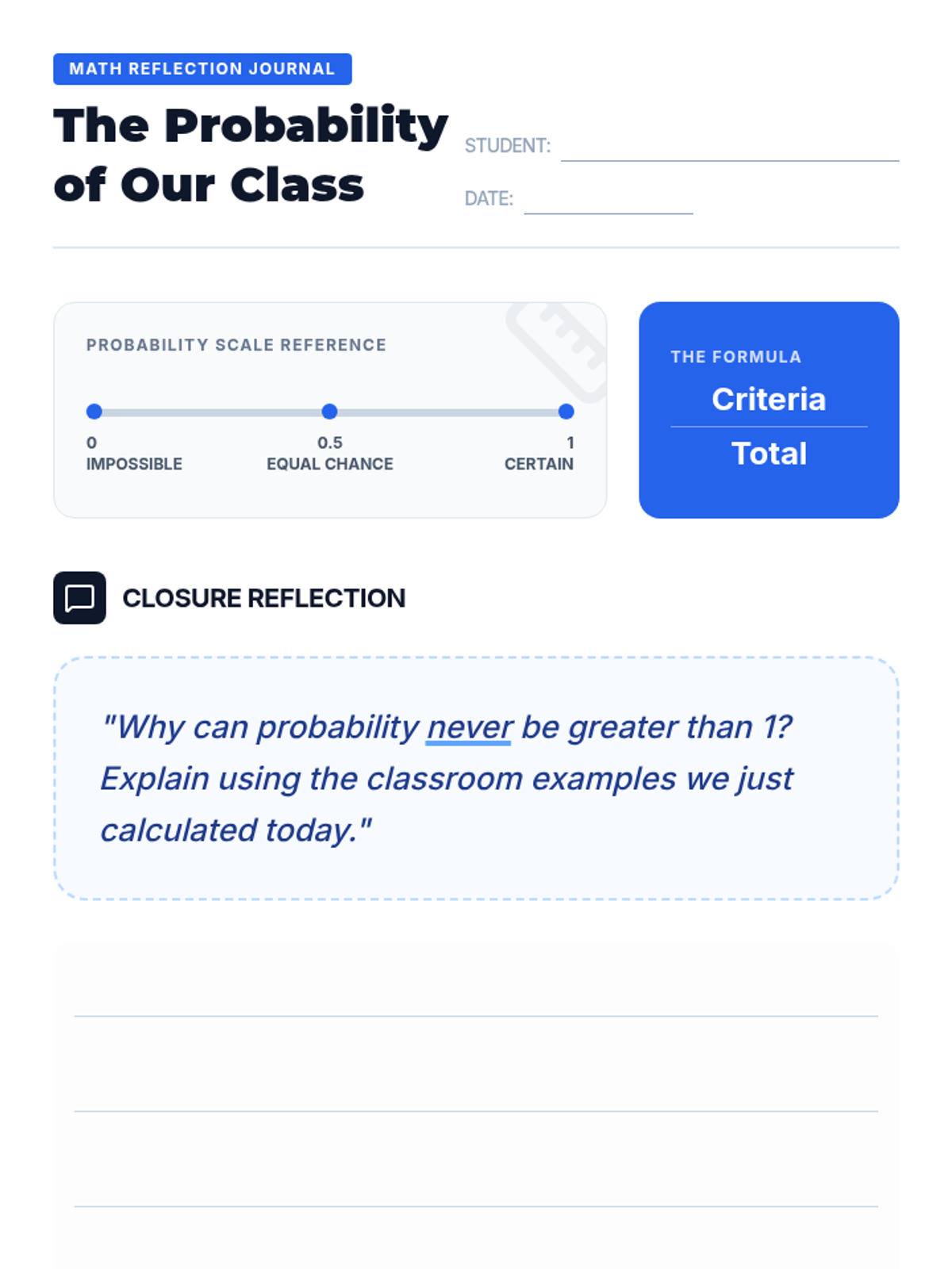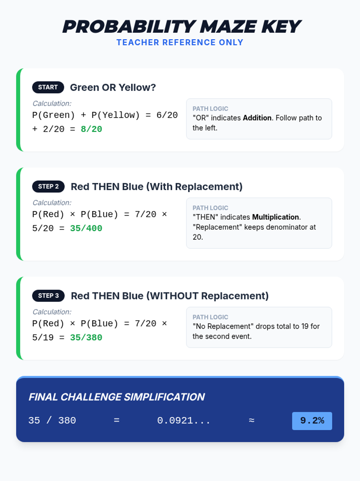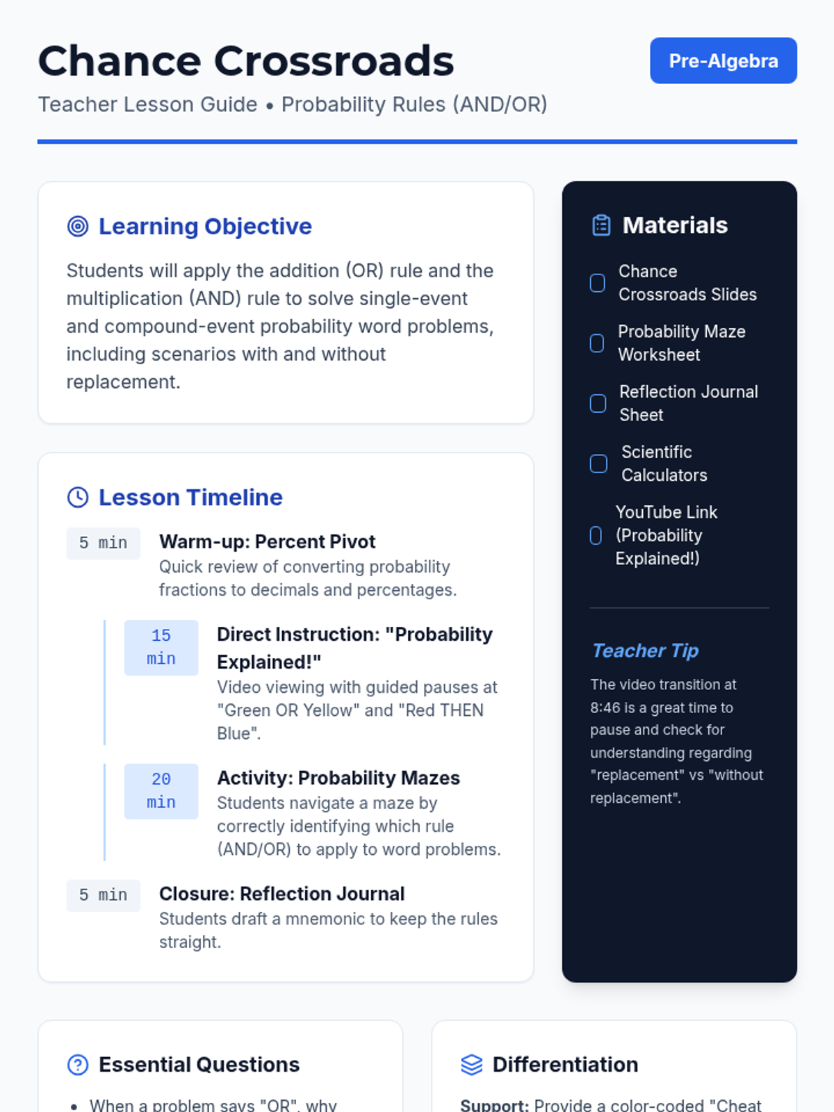 A Pre-Algebra lesson focusing on the addition (OR) and multiplication (AND) rules of probability, featuring a video-based instruction, a probability maze activity, and a reflective journal.
