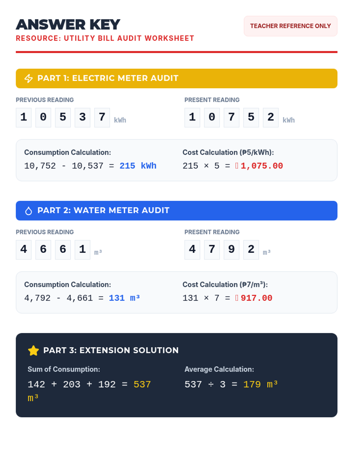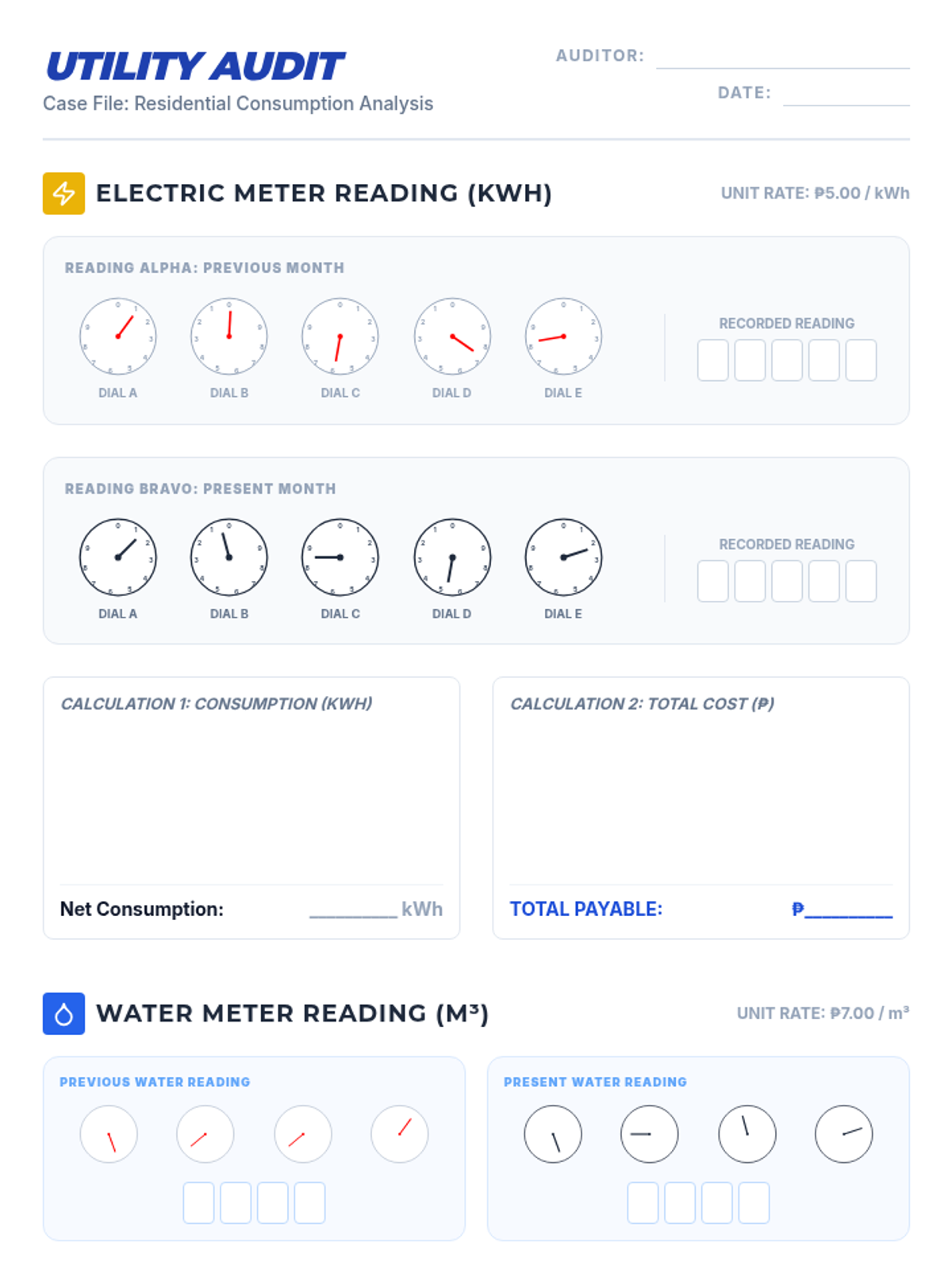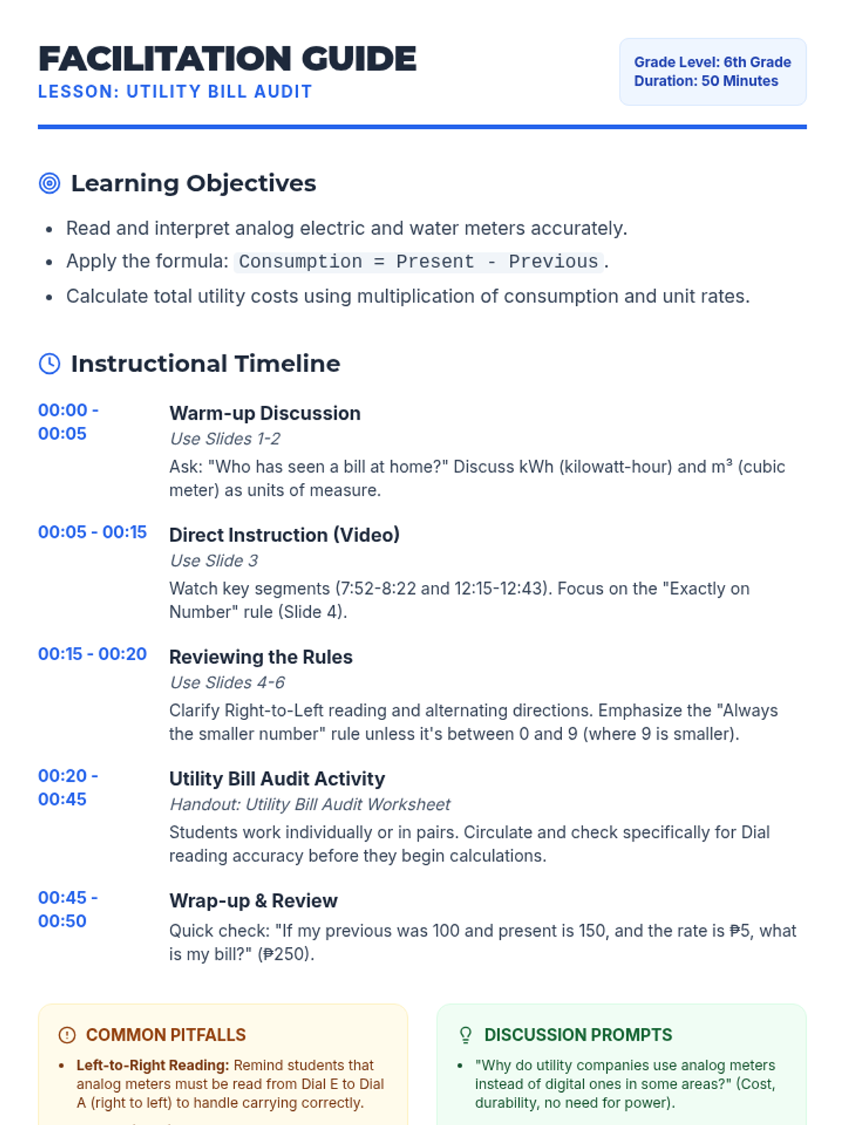 A math lesson where students learn to read analog electric and water meters, calculate monthly consumption, and determine the total cost based on unit rates. Includes a video-based instruction segment and a mock utility bill audit activity.