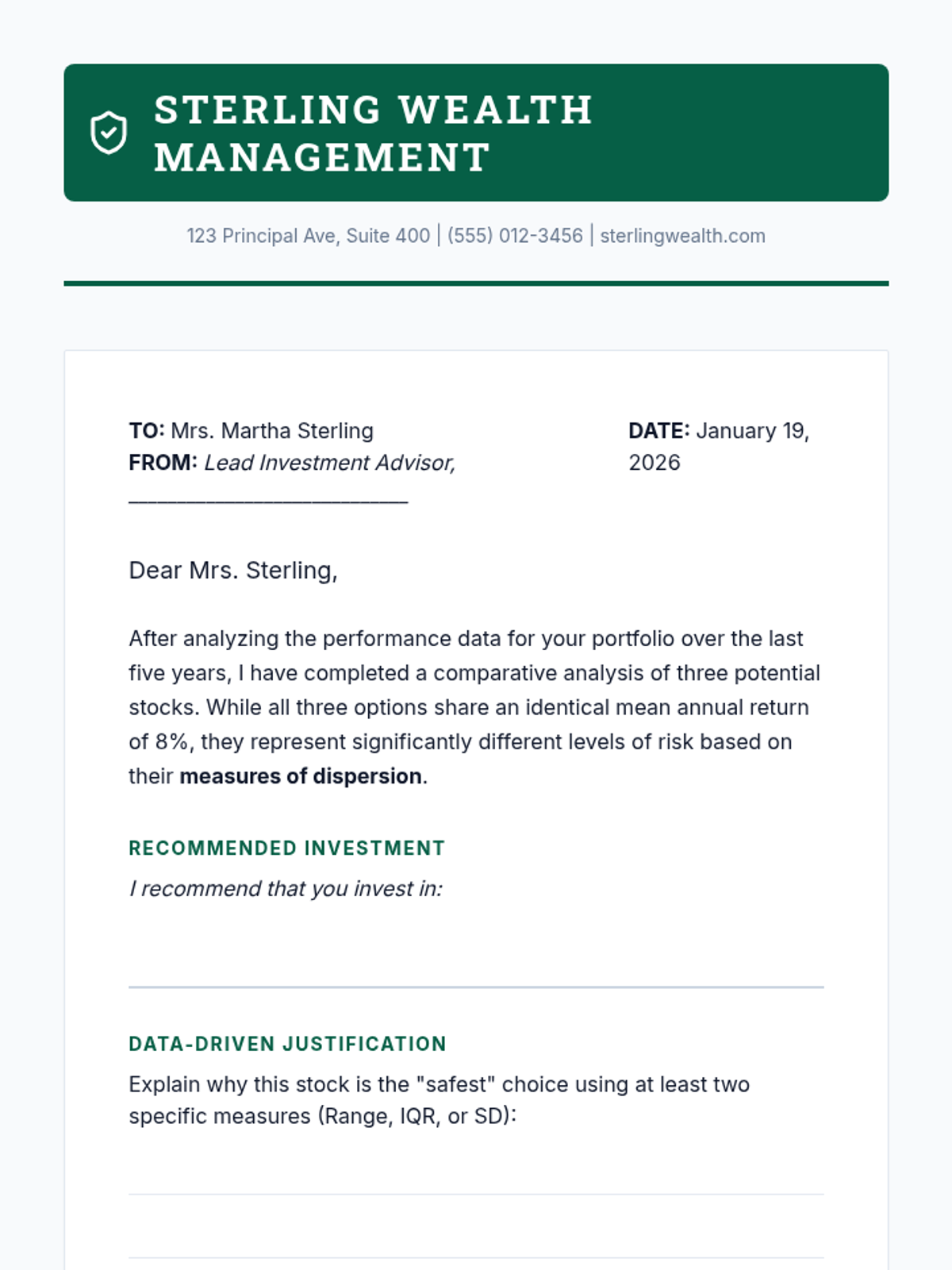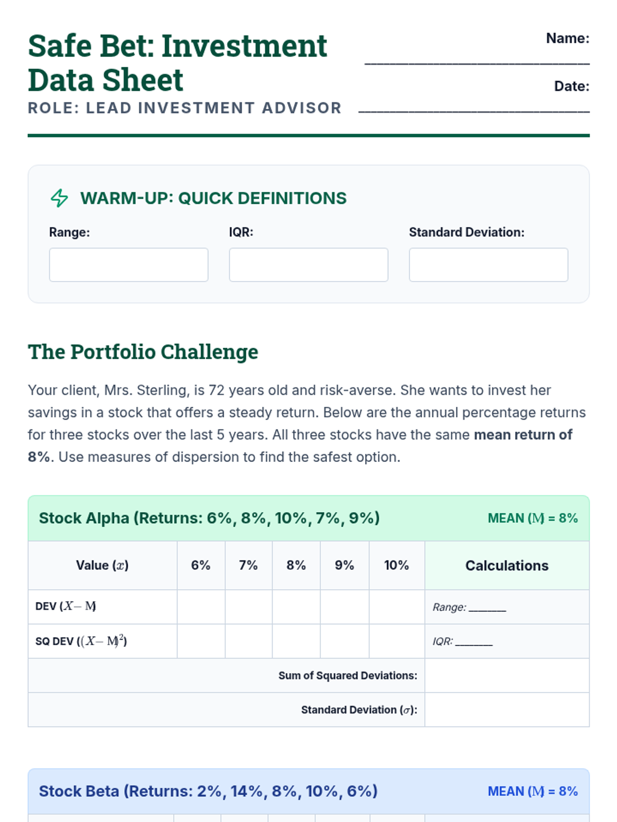 Students step into the role of an investment advisor to evaluate the risk and consistency of three stocks using measures of dispersion (Range, IQR, and Standard Deviation). They will use their calculations to make a data-driven recommendation for a risk-averse client.