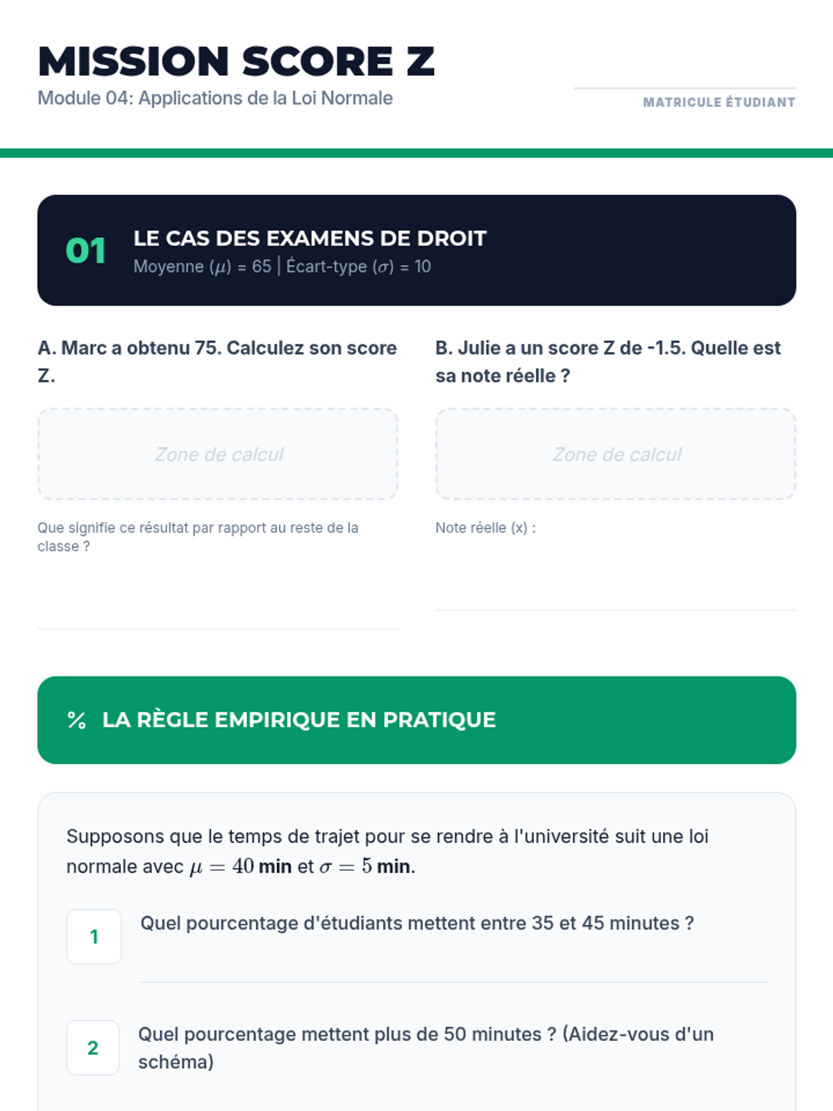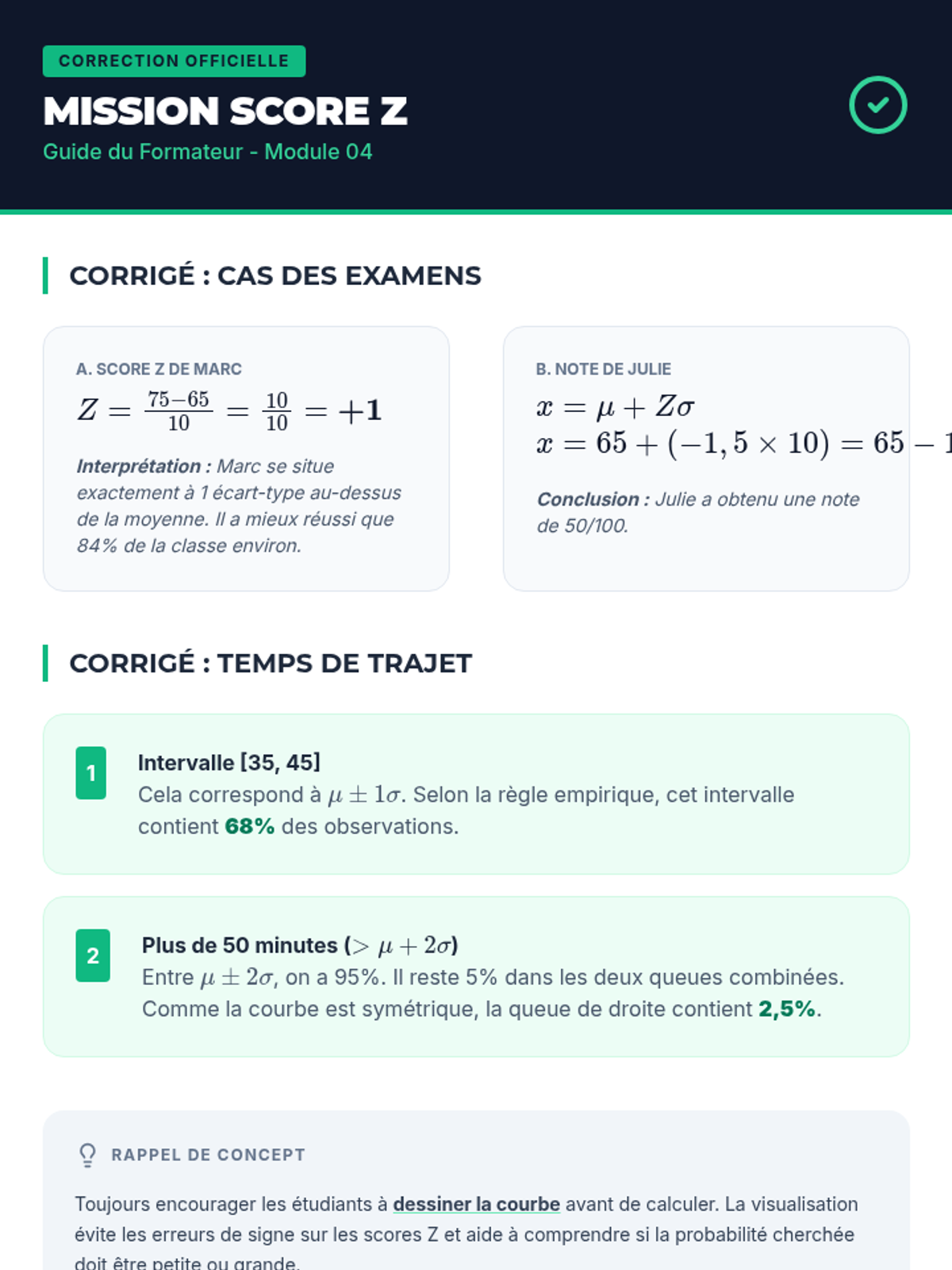Introduction à la distribution normale, au calcul des scores Z et à l'utilisation de la table de probabilités pour l'inférence.
