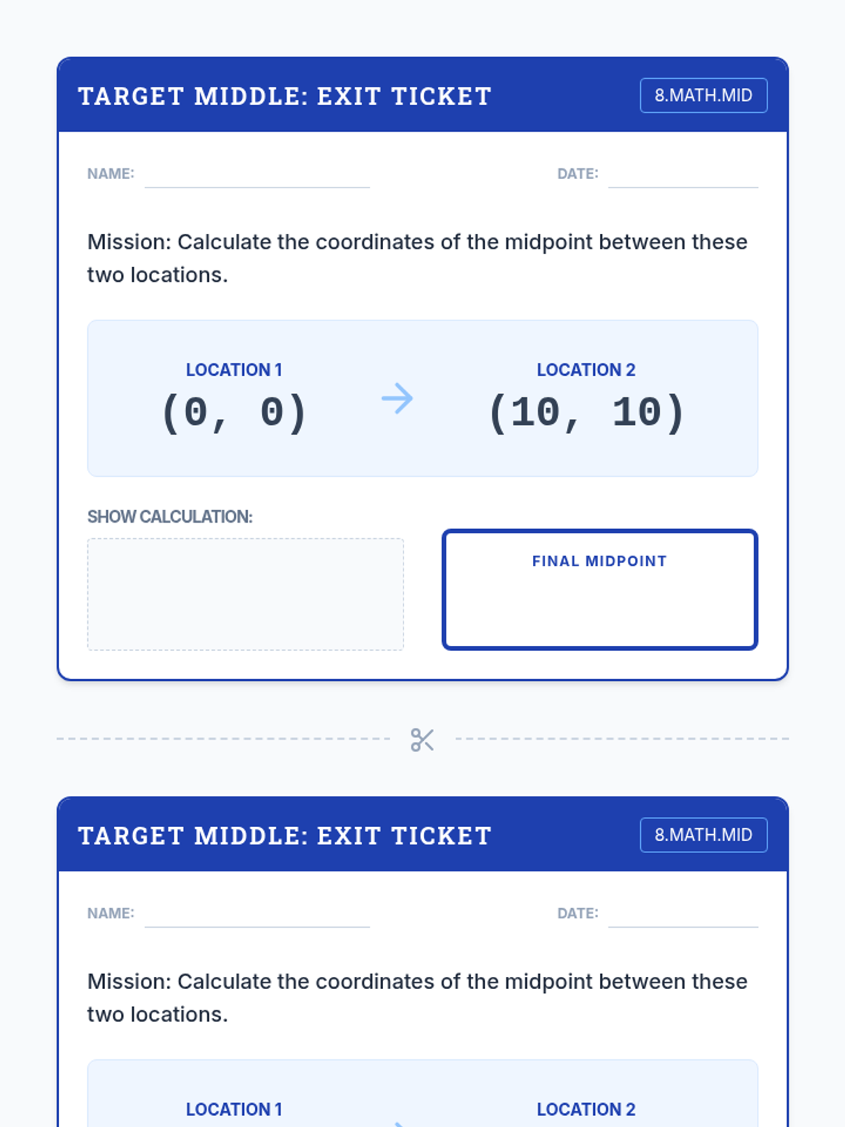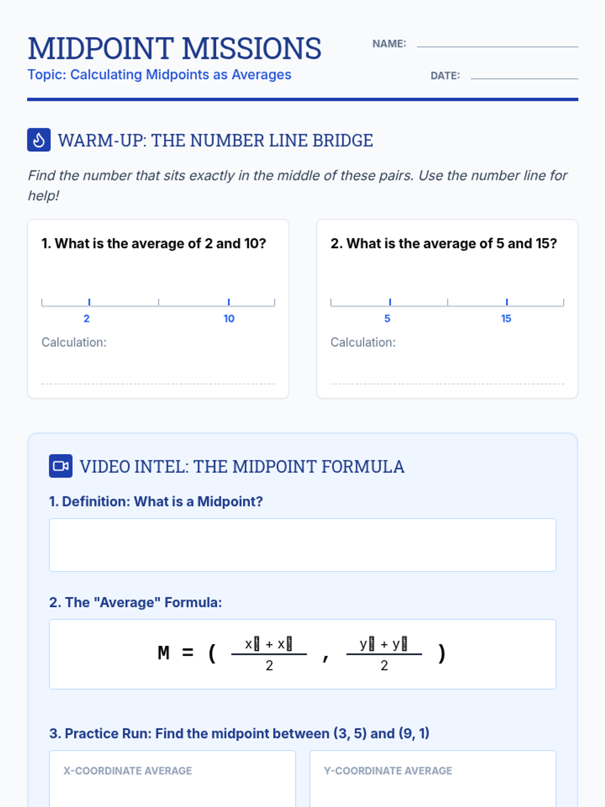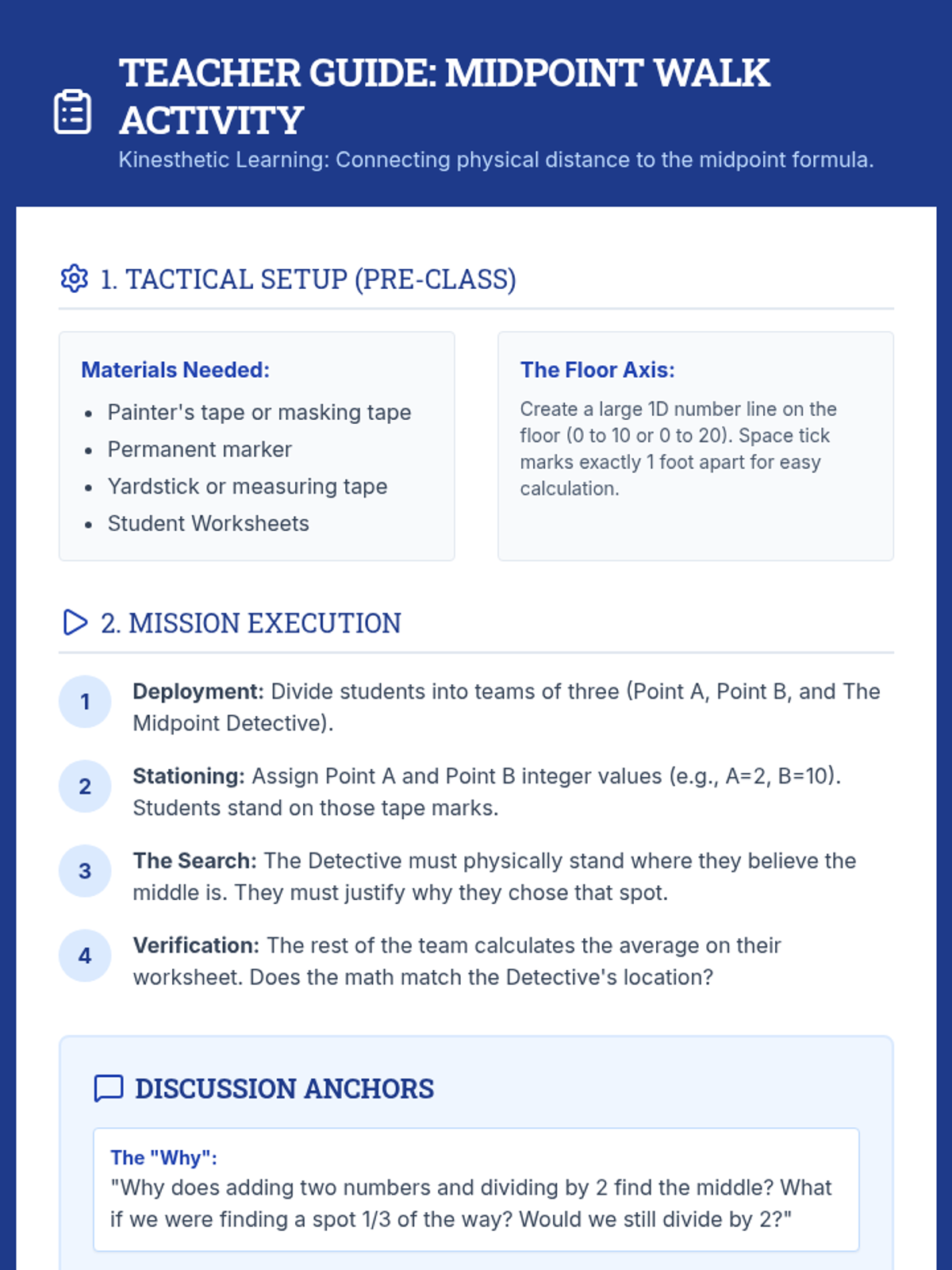 A foundational lesson for 8th-grade students to master the midpoint formula using the concept of averages, focusing on positive integers and physical movement.