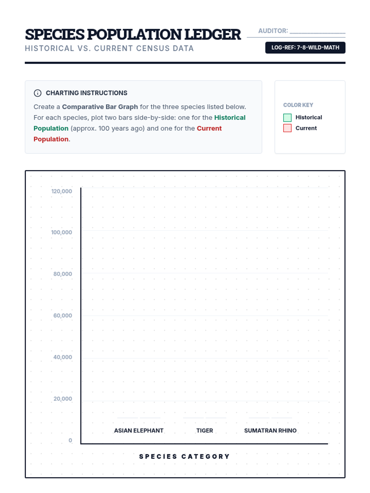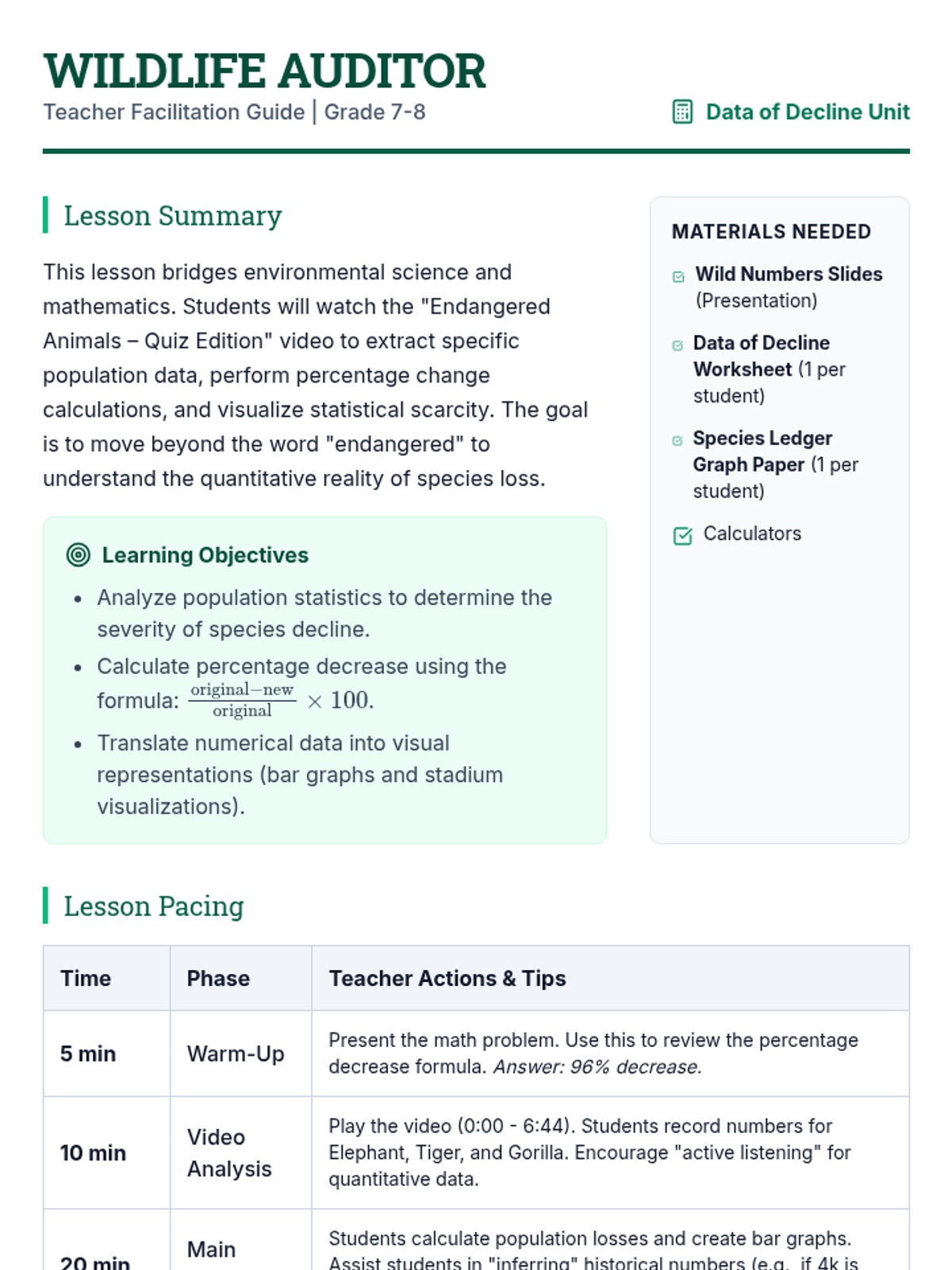 A data-focused lesson where students analyze the population decline of endangered species through statistics, percentage calculations, and visual graphing. Students use real-world data from a documentary to understand the severity of the biodiversity crisis.