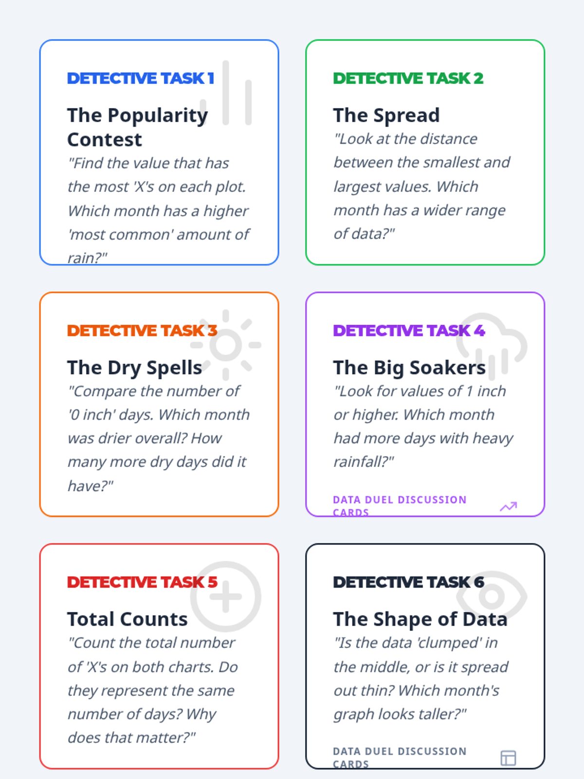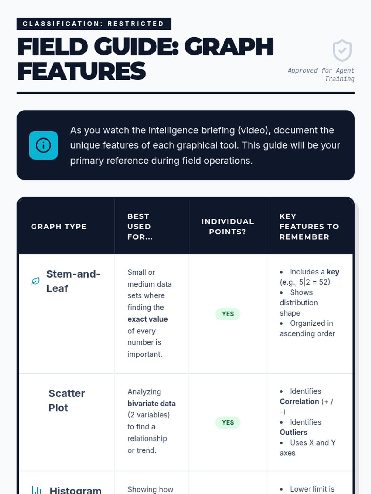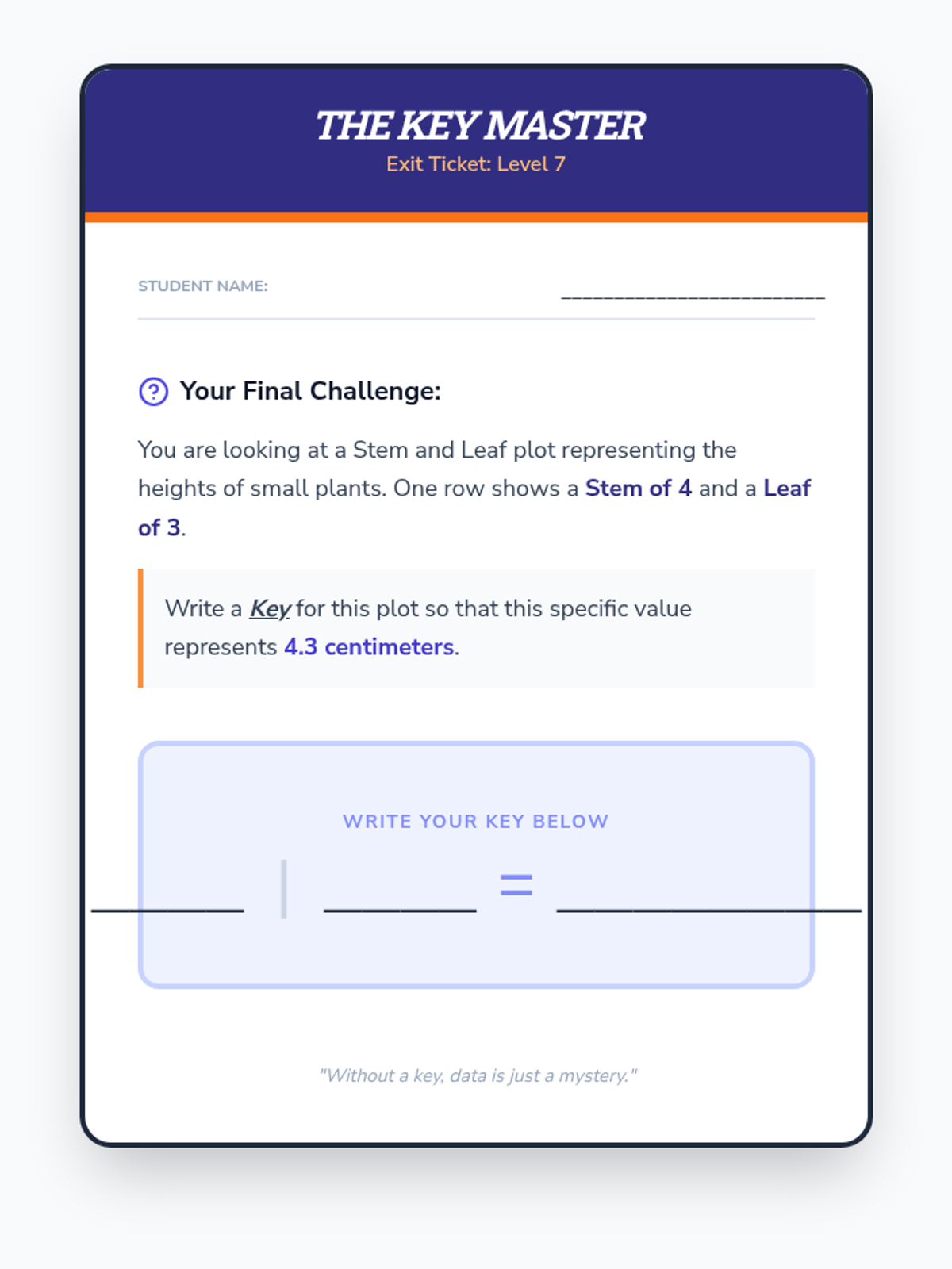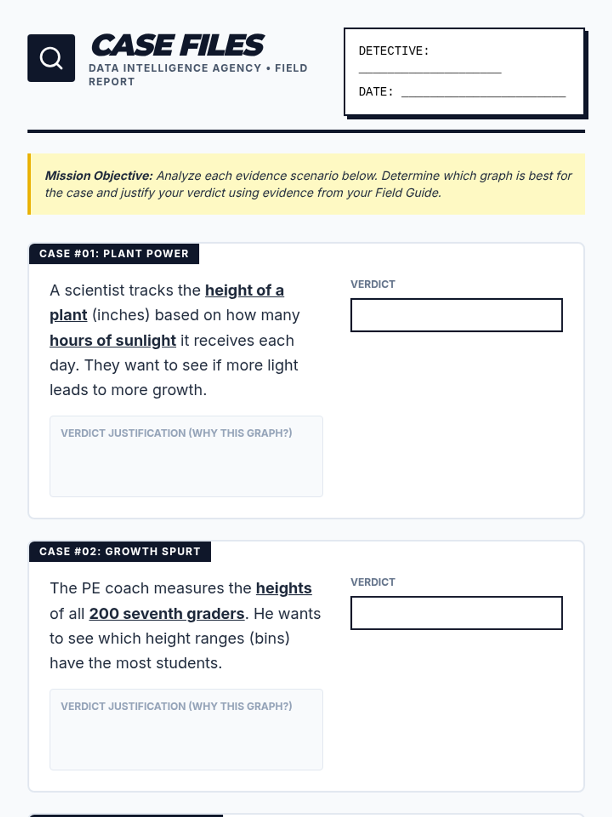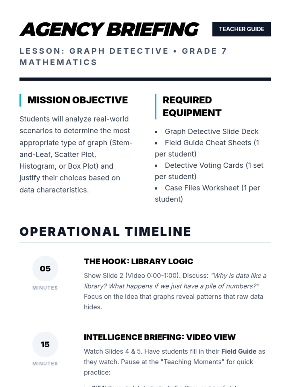 Students become data detectives as they analyze real-world scenarios to determine which graphical representation—Stem-and-Leaf, Scatter Plot, Histogram, or Box-and-Whisker—best reveals the secrets hidden within the numbers.