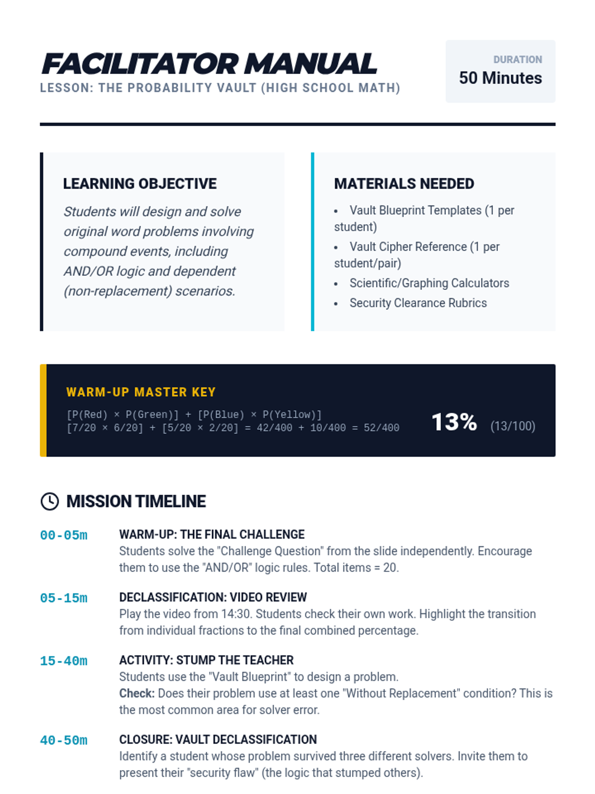 A high-school level lesson focused on designing and solving complex probability word problems using compound events, featuring a 'Stump the Teacher' activity.