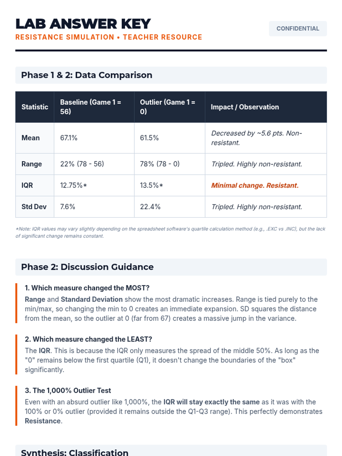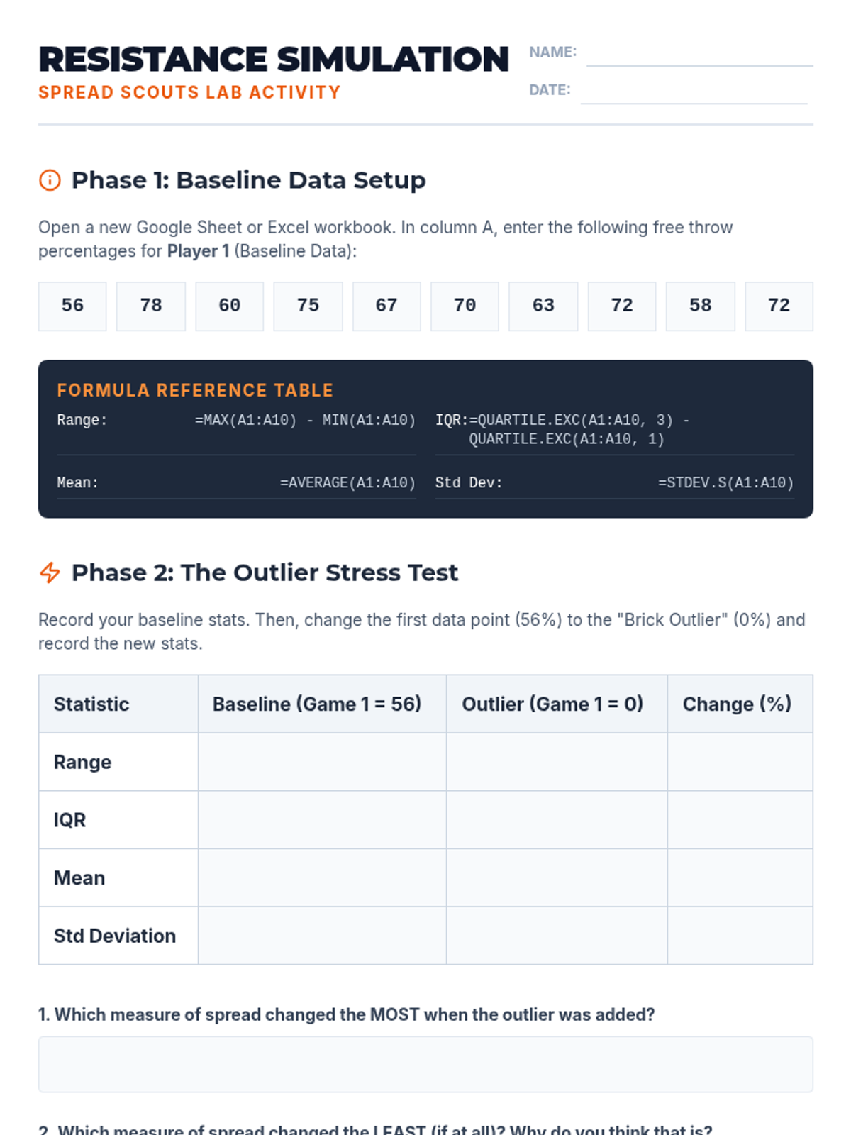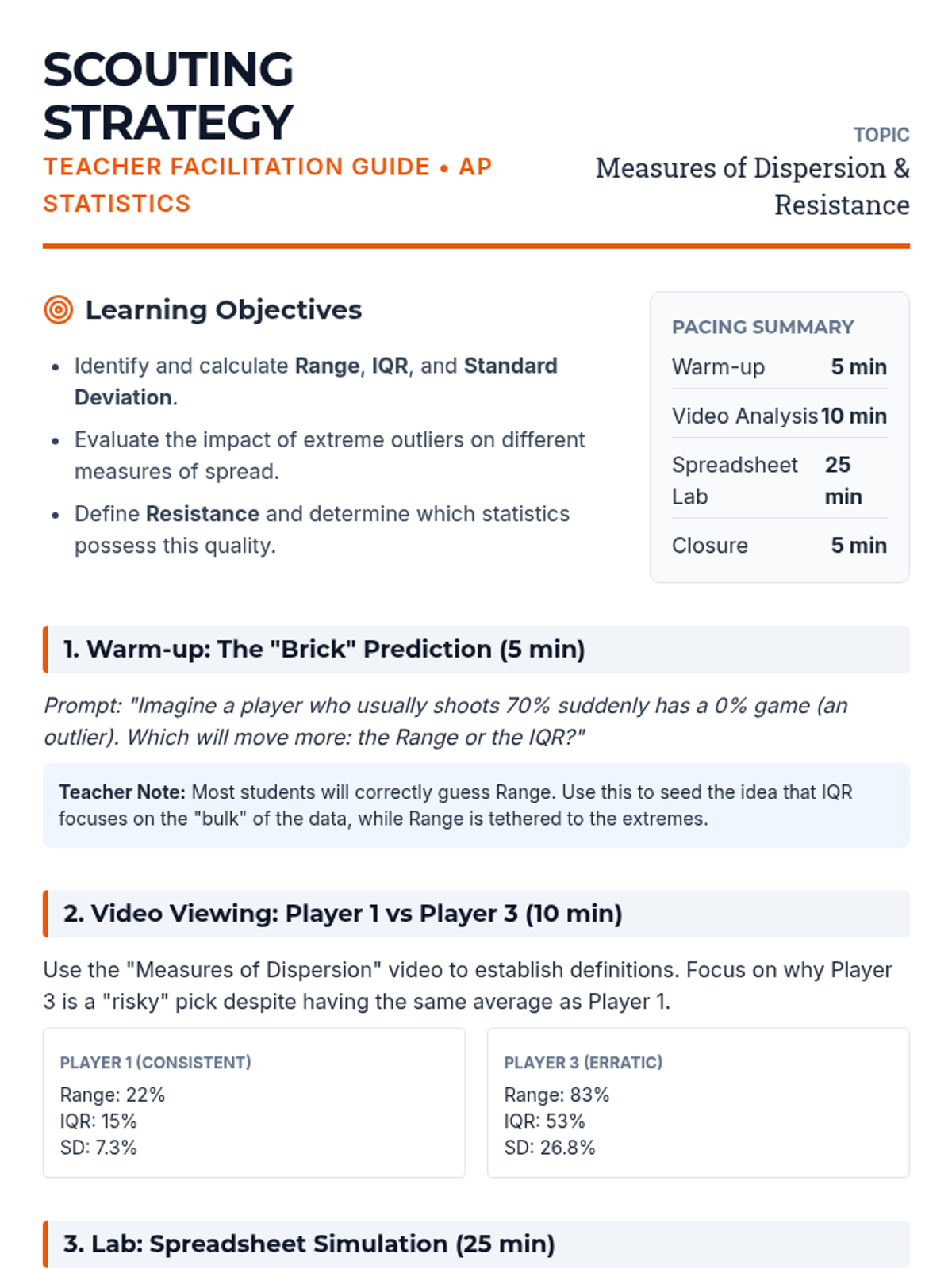 An AP Statistics lesson exploring how outliers impact measures of dispersion (Range, IQR, and Standard Deviation), featuring a video-based case study and a spreadsheet simulation to determine which statistics are 'resistant'.