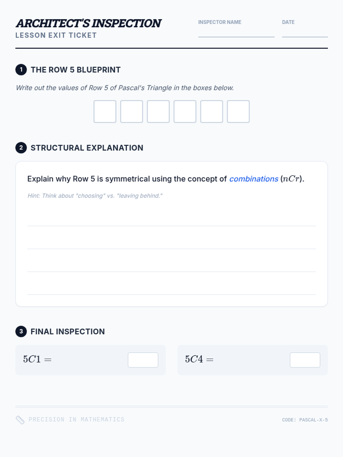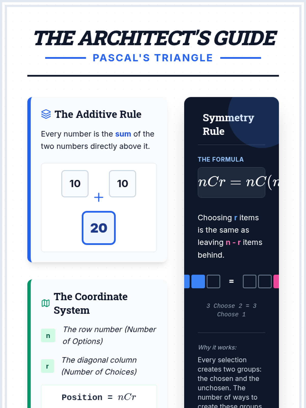 Students explore the deep connection between the recursive nature of Pascal's Triangle and the combinatorial formula C(n,k), moving from basic addition to algebraic derivation.