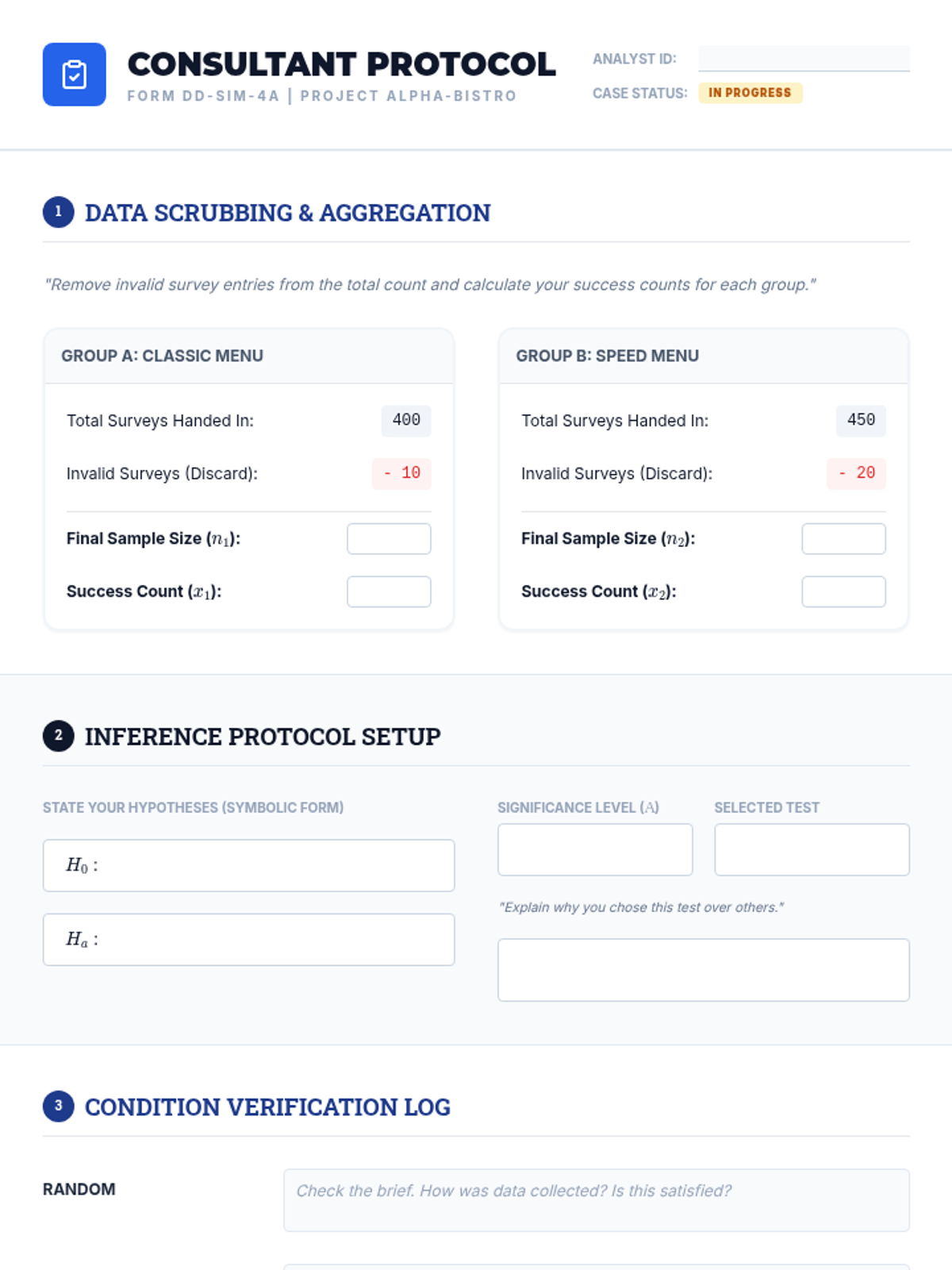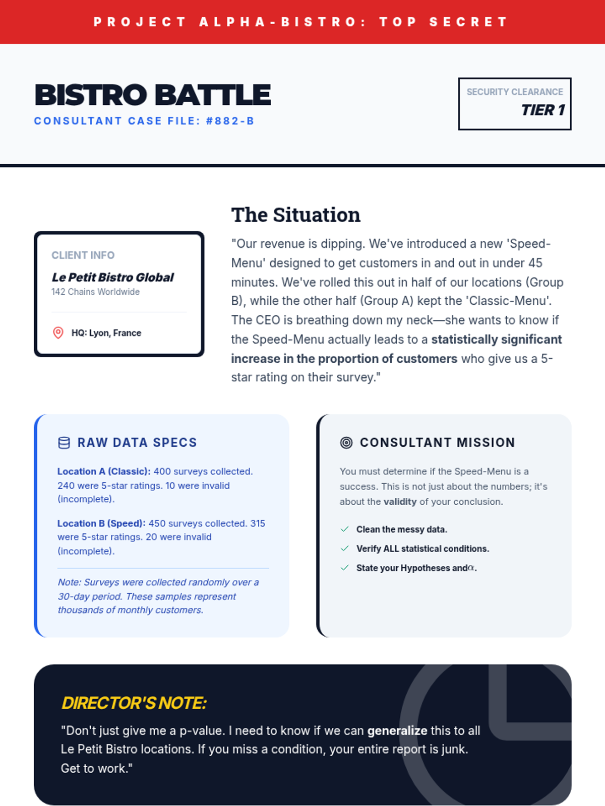 Part 1 of a simulation where students act as consultants to clean, organize, and select the correct test for a messy real-world dataset.