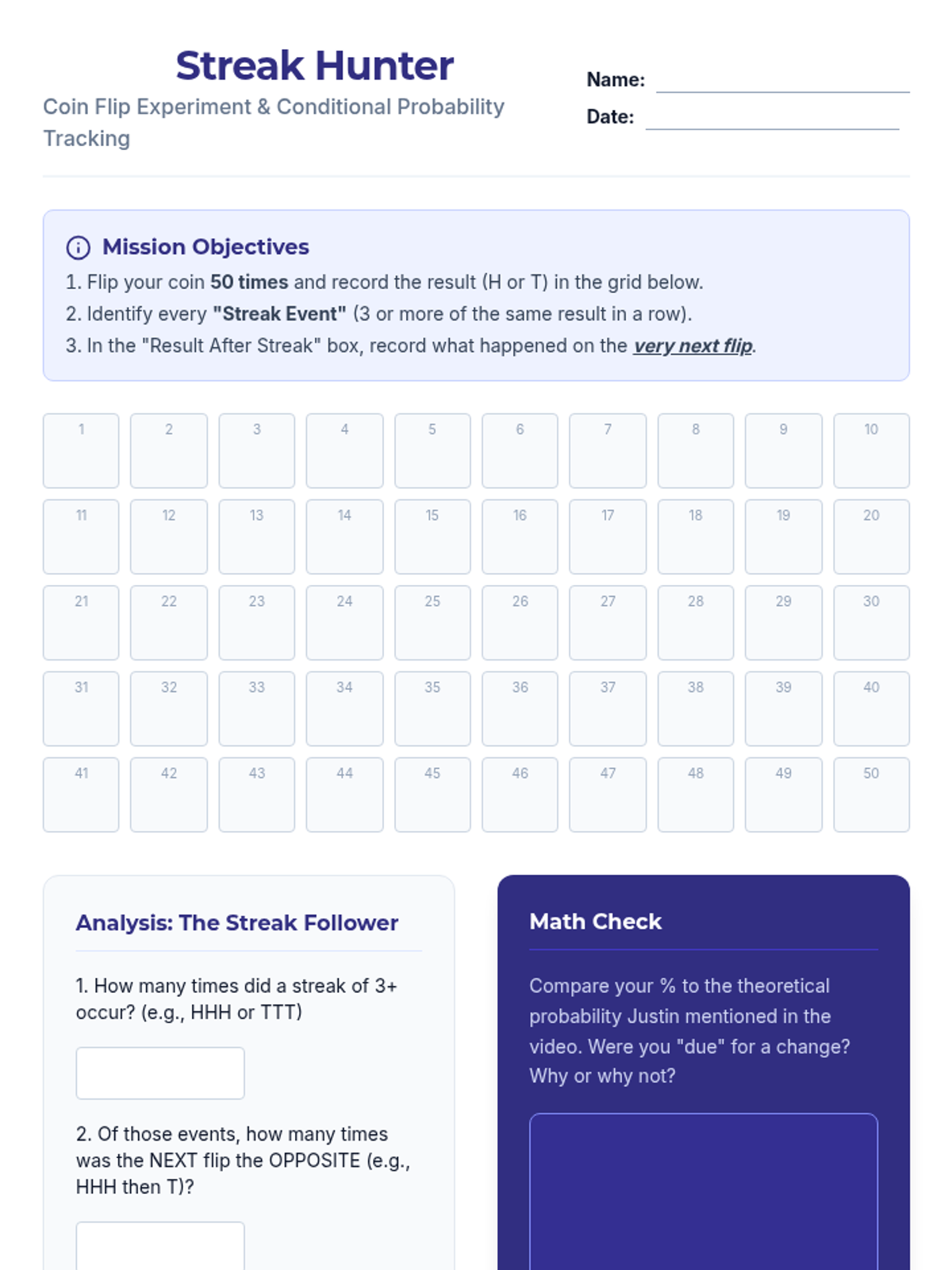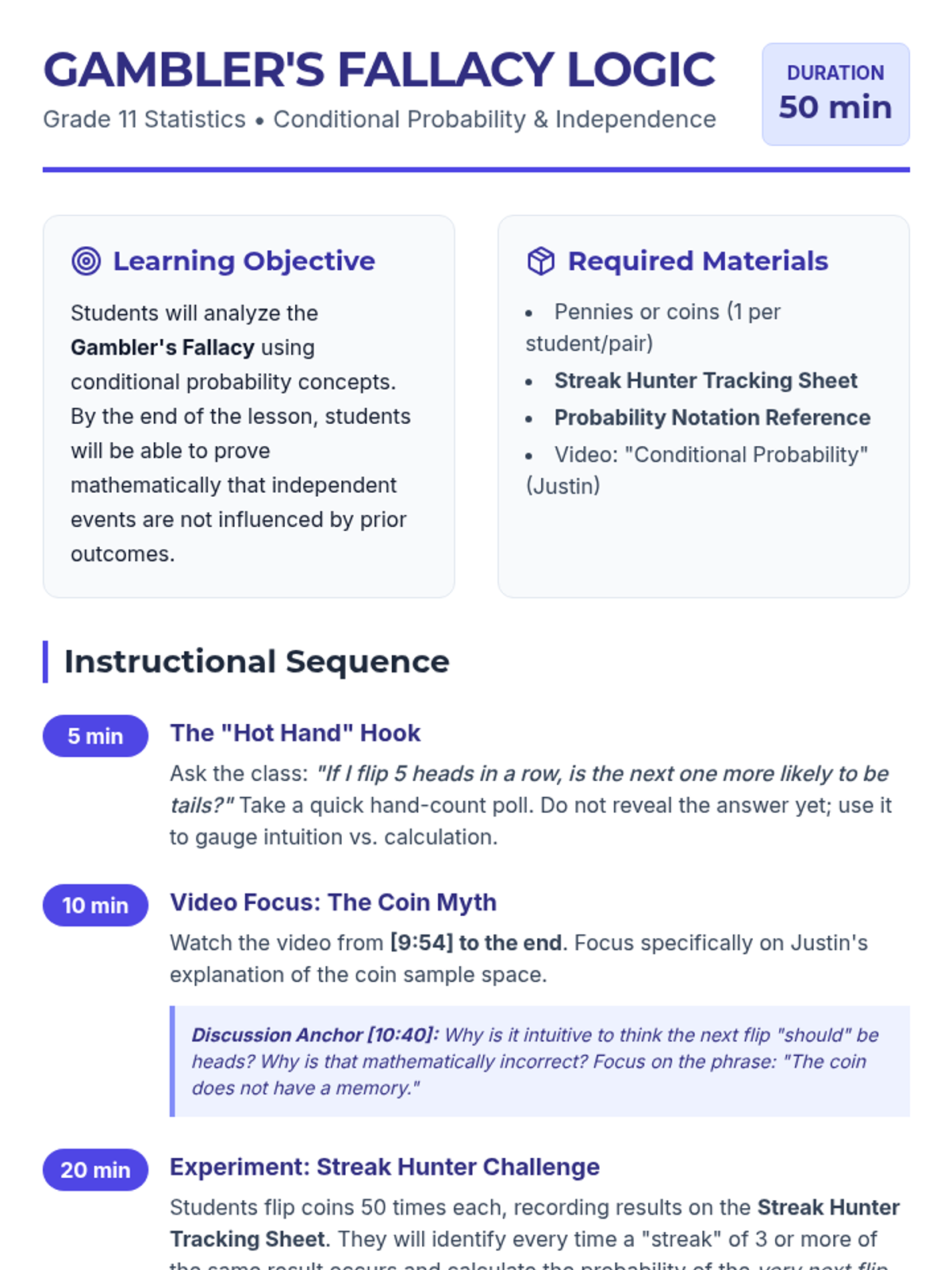 An 11th-grade statistics lesson exploring the Gambler's Fallacy through conditional probability and hands-on experimentation. Students investigate whether past coin flips influence future outcomes using data tracking and the P(A|B) formula.
