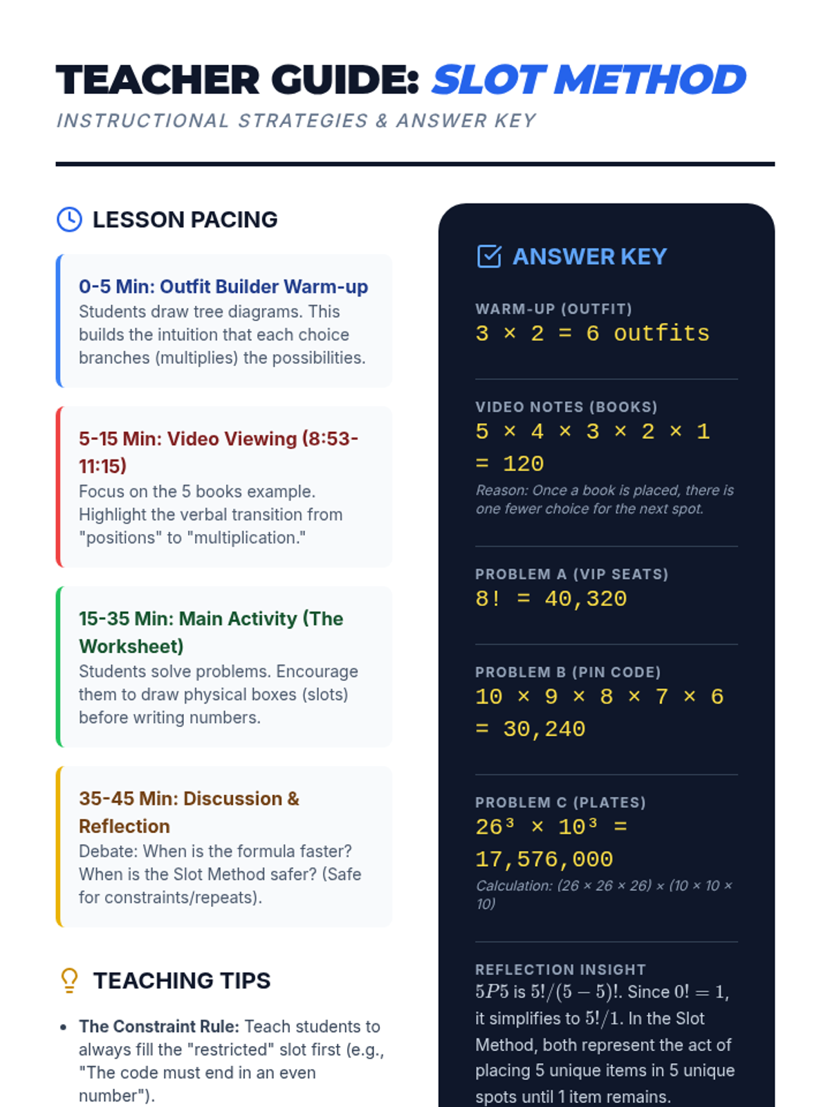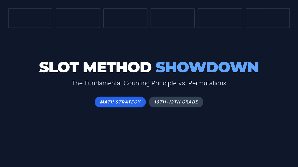 A high school math lesson focused on using the Fundamental Counting Principle (the 'Slot Method') as a flexible alternative to the permutation formula for solving arrangement problems. Students transition from tree diagrams to multiplying possibilities for seating, passwords, and license plates.