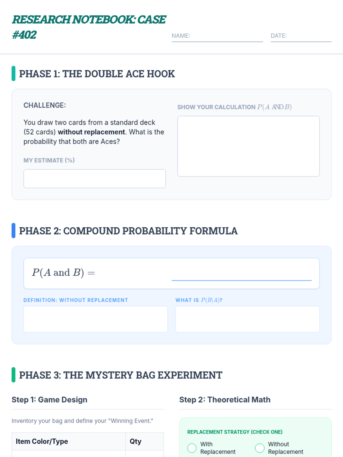 A high-level honors probability lesson where students explore compound events through card challenges, a structured video review, and a hands-on 'Mystery Bag' experiment comparing theoretical models to experimental data.