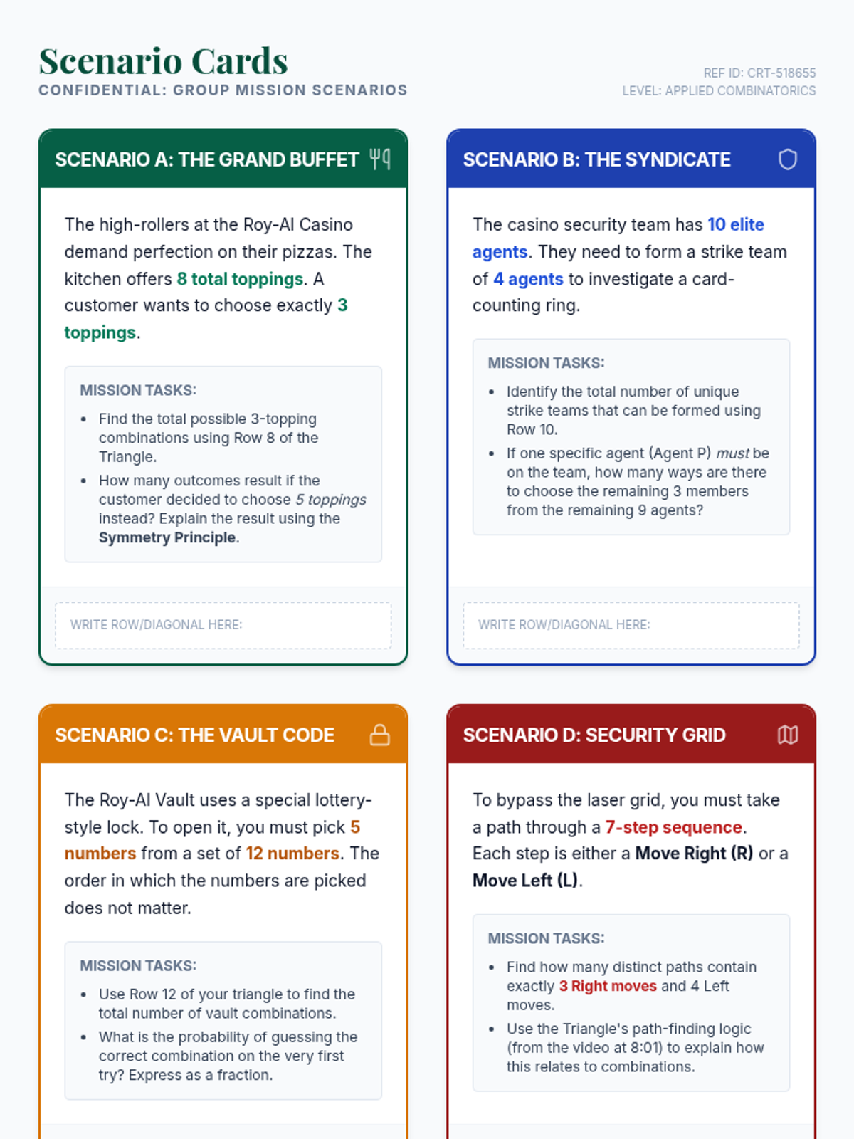 A collaborative high school math lesson where students use Pascal's Triangle to solve complex combination and probability scenarios in a high-stakes 'Casino Roy-Al' theme.