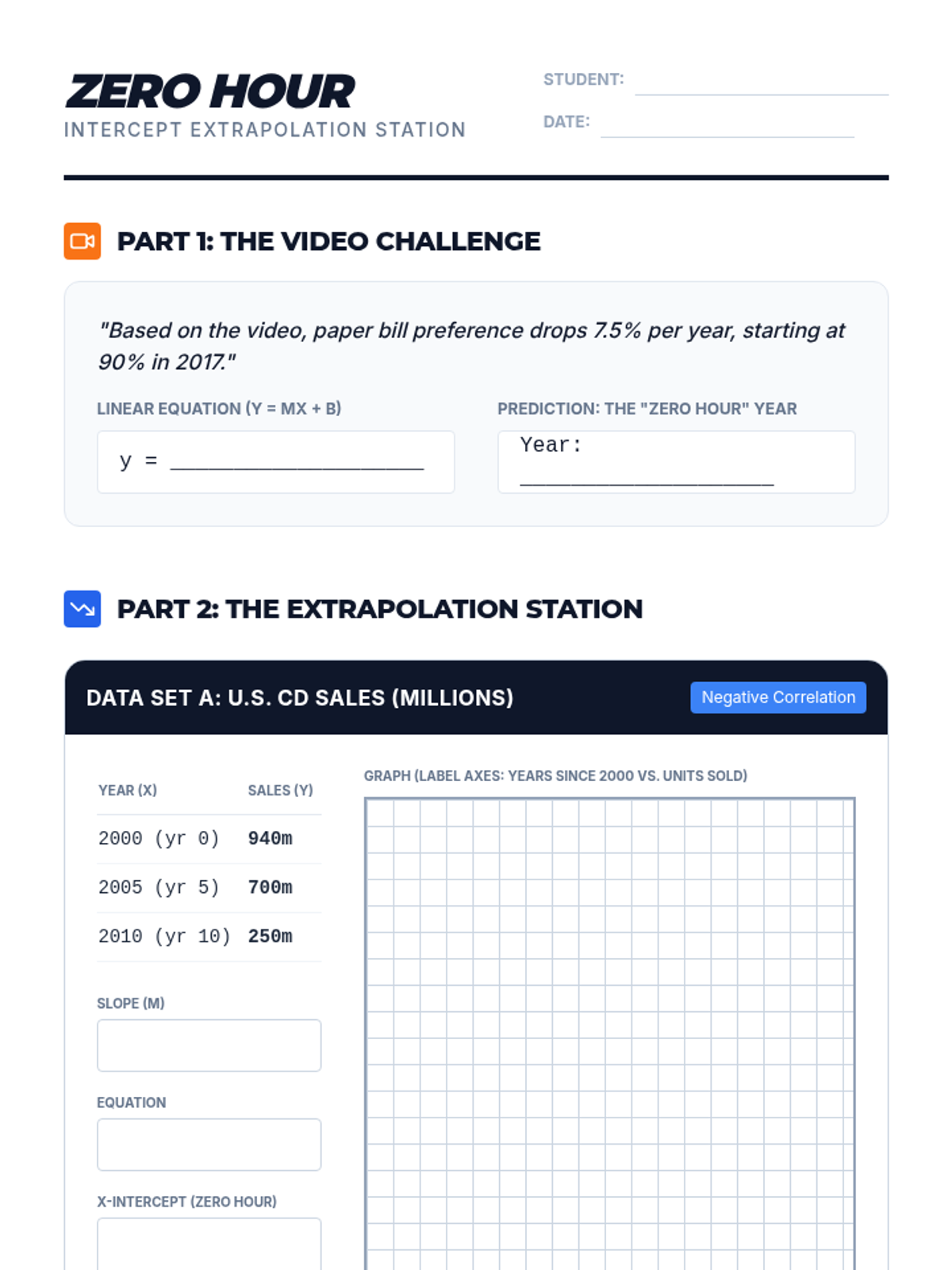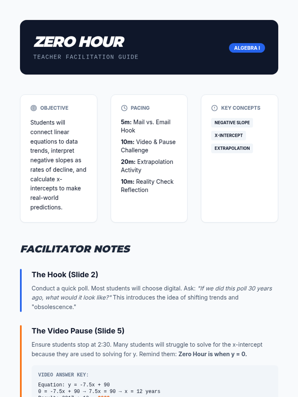 Students explore the practical application of linear equations by analyzing data trends, specifically focusing on negative correlations and calculating x-intercepts to predict when values hit zero. The lesson uses a real-world tech-transition video as a springboard for extrapolation.