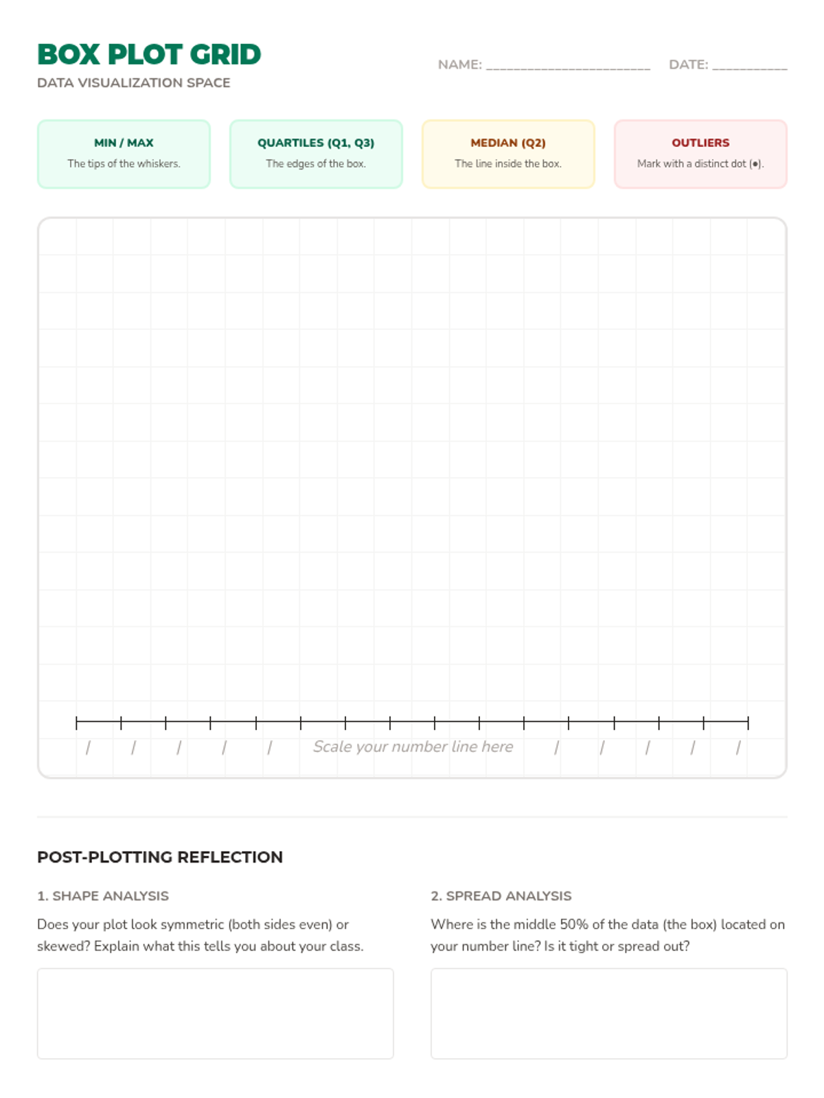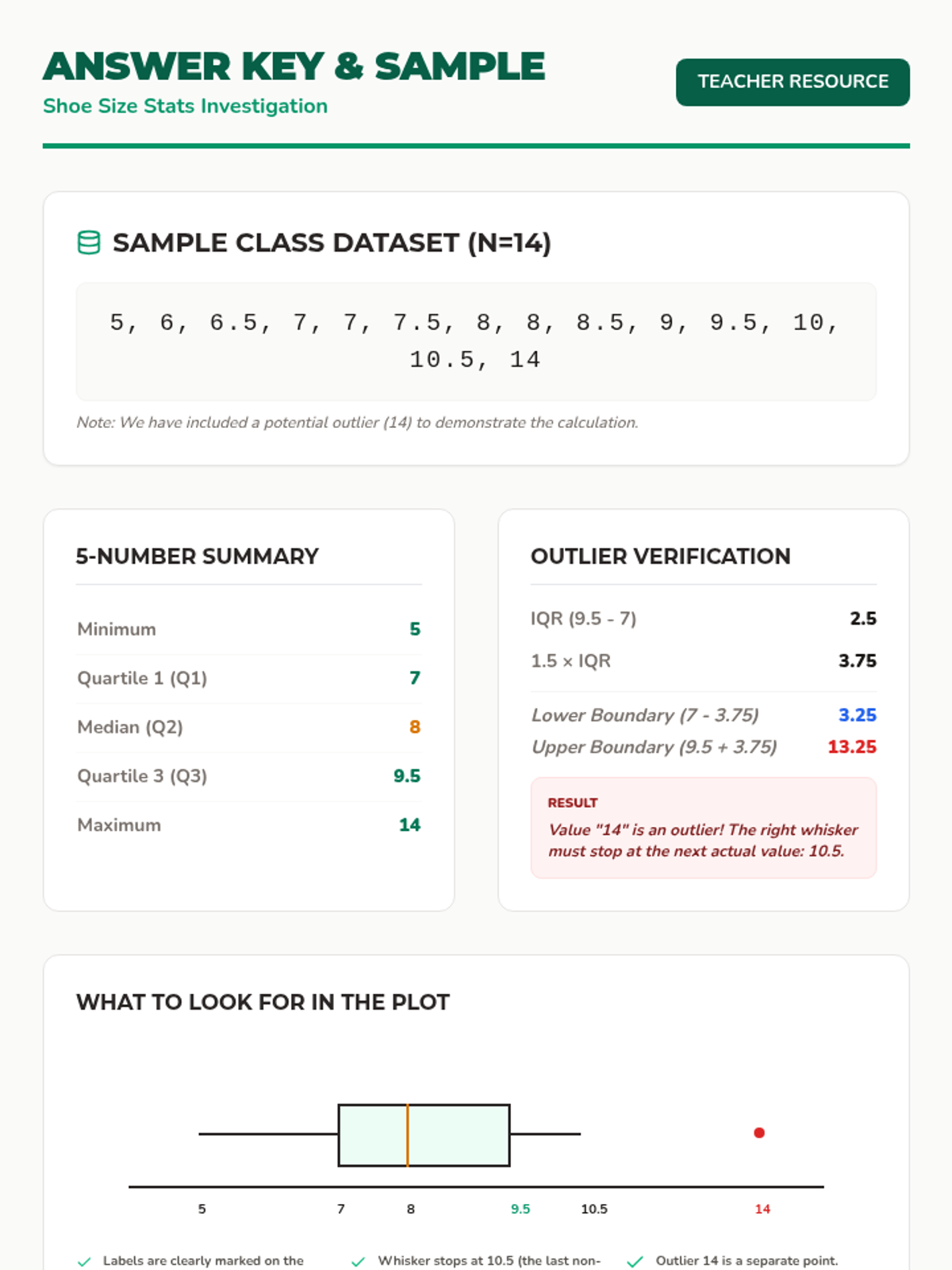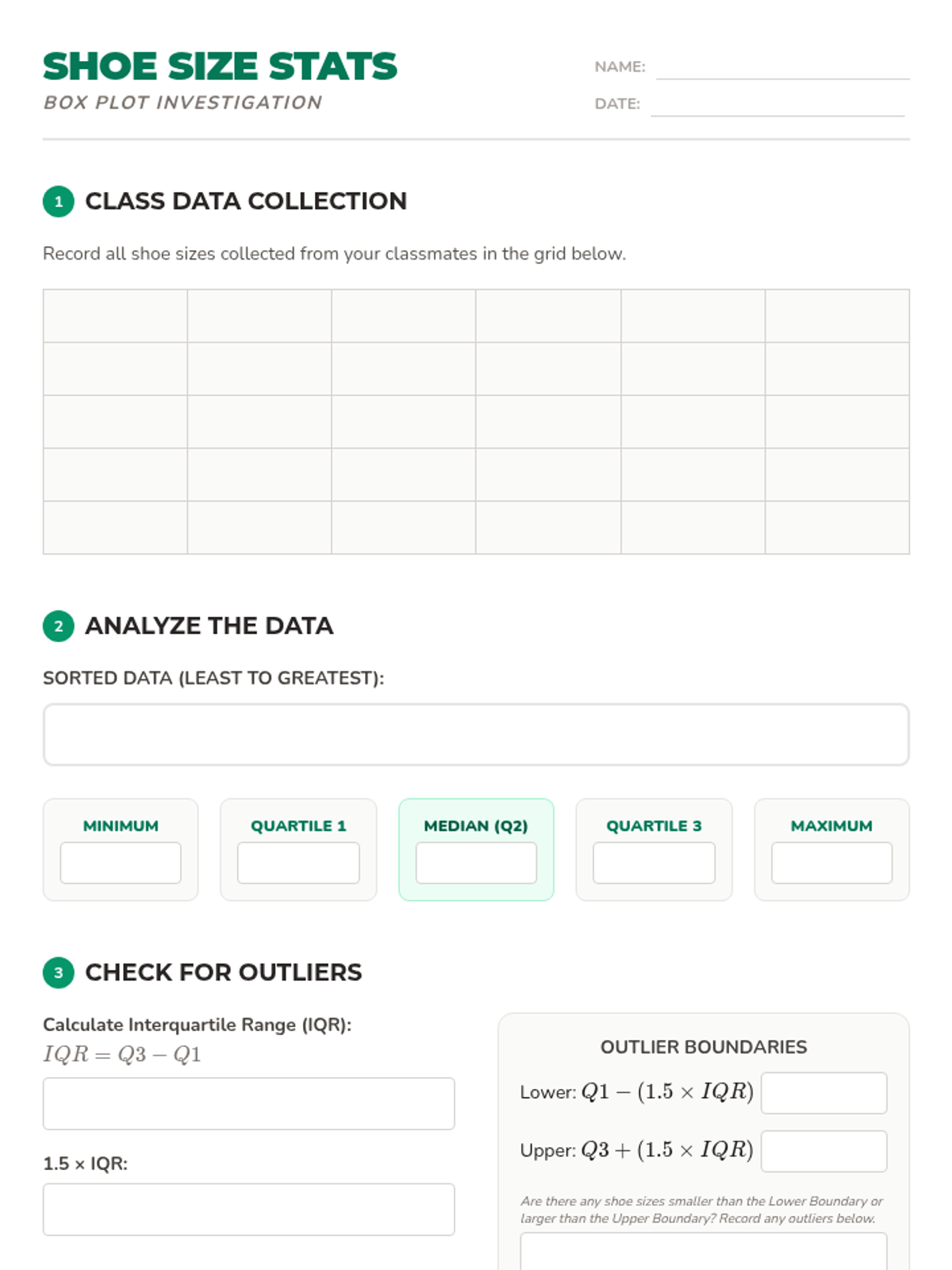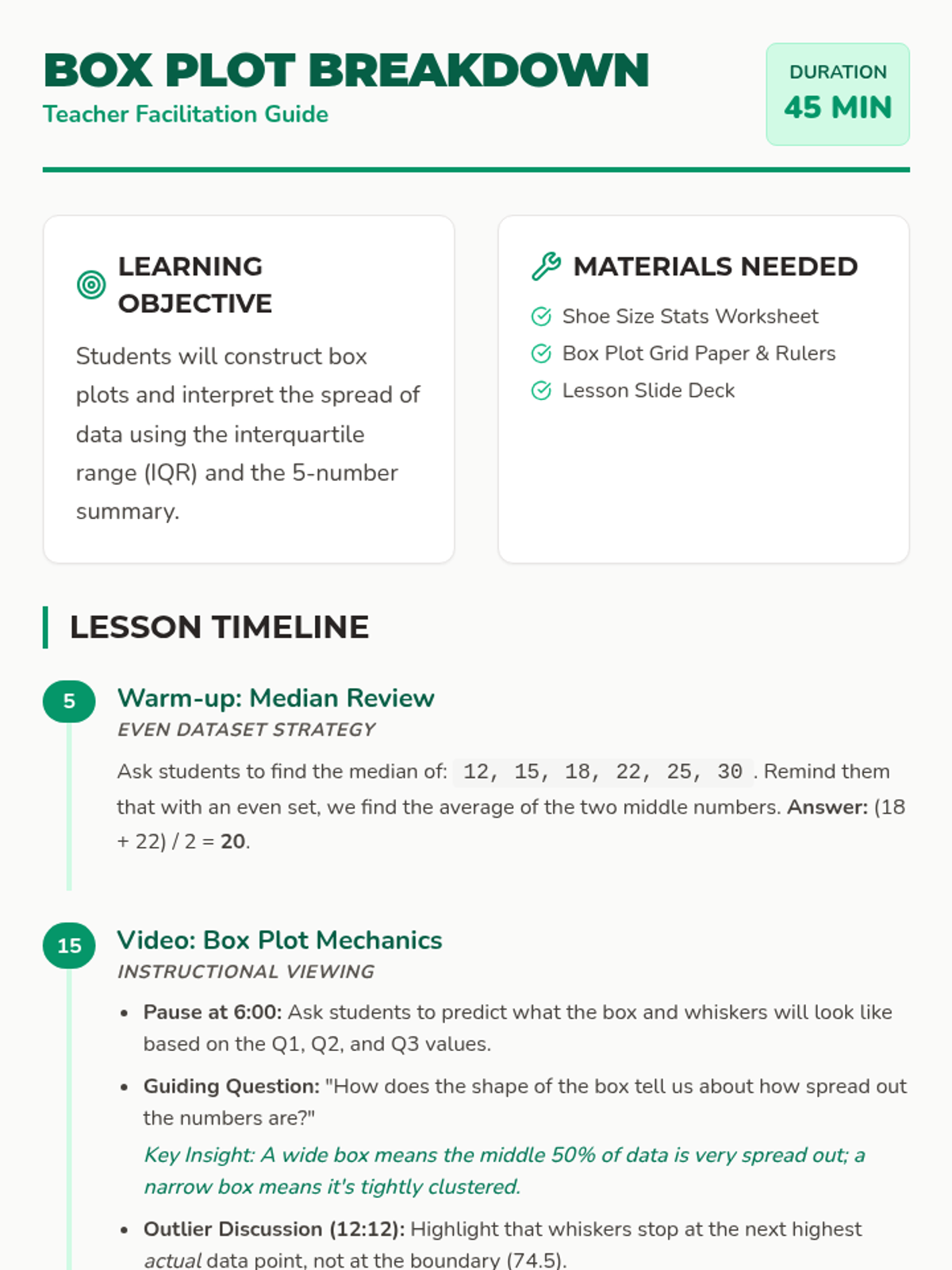 A hands-on lesson where 7th-grade students collect class shoe size data, calculate the 5-number summary, and construct precise box and whisker plots to analyze data spread and symmetry.
