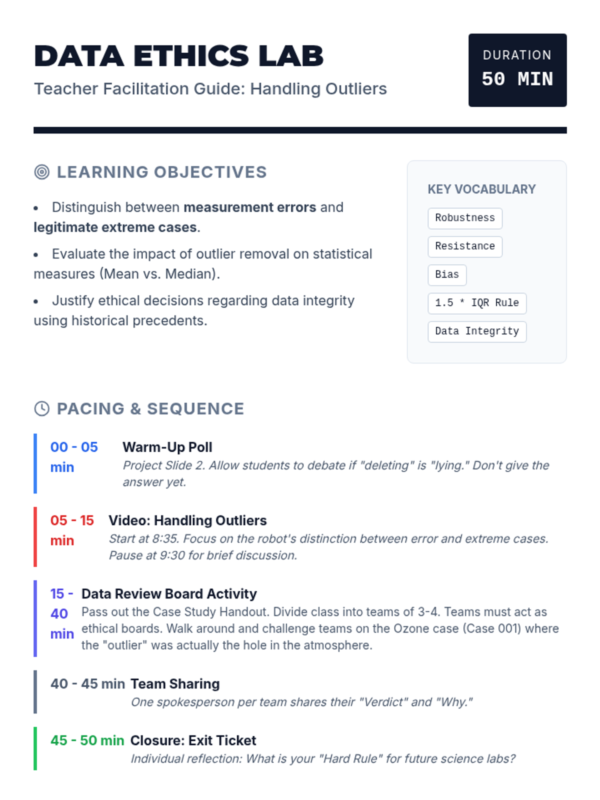 A high school statistics lesson focusing on the ethical implications of handling outliers in scientific data, featuring a historical case study on the Antarctic Ozone Hole.