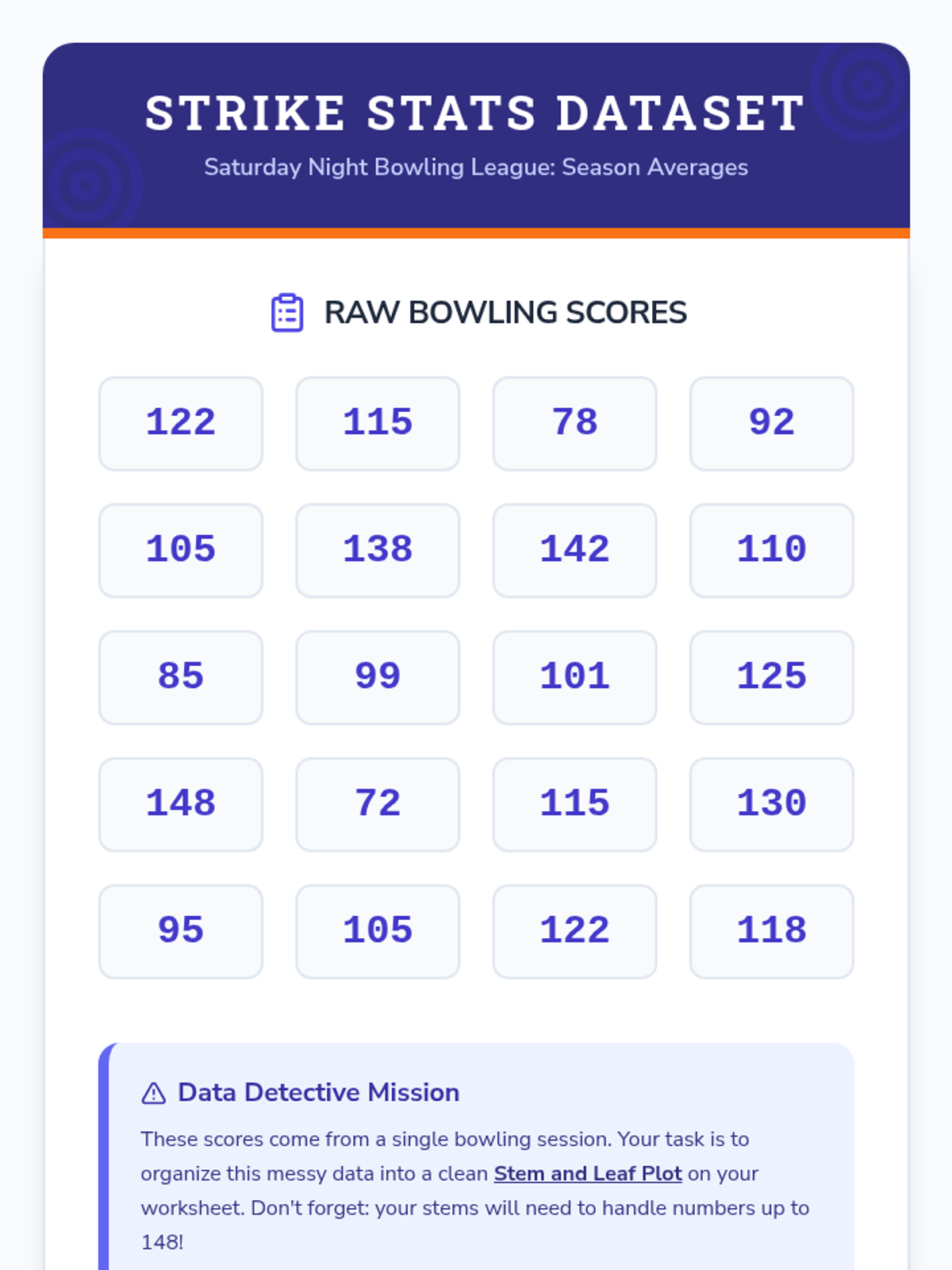 A lesson focused on creating stem and leaf plots for large numbers (over 100) and the critical importance of including a 'Key' to eliminate ambiguity. Students analyze bowling scores and practice identifying median, mode, and range.