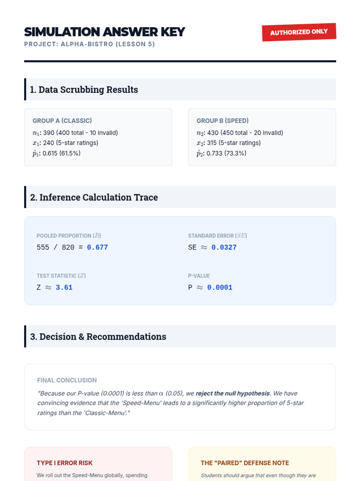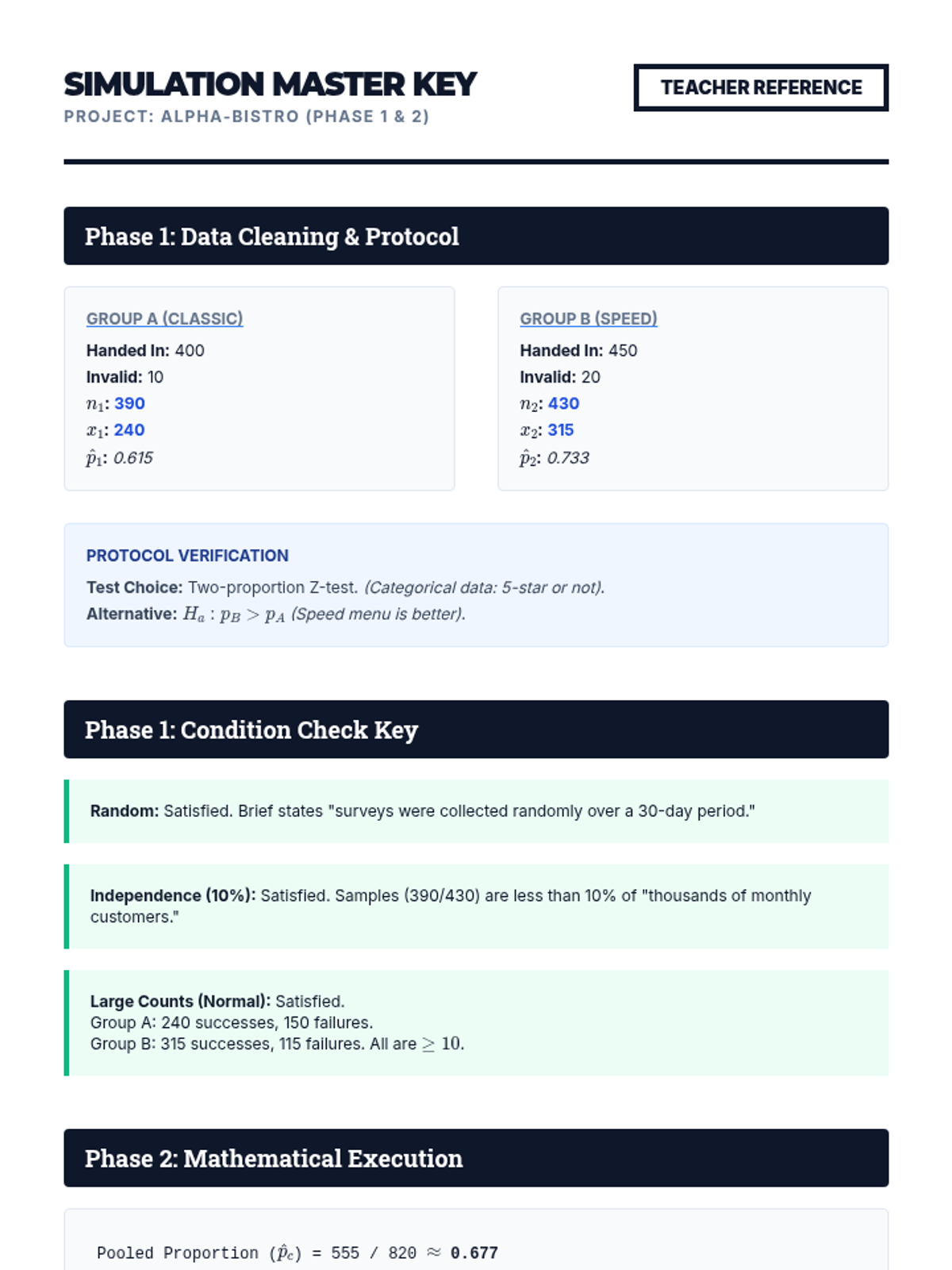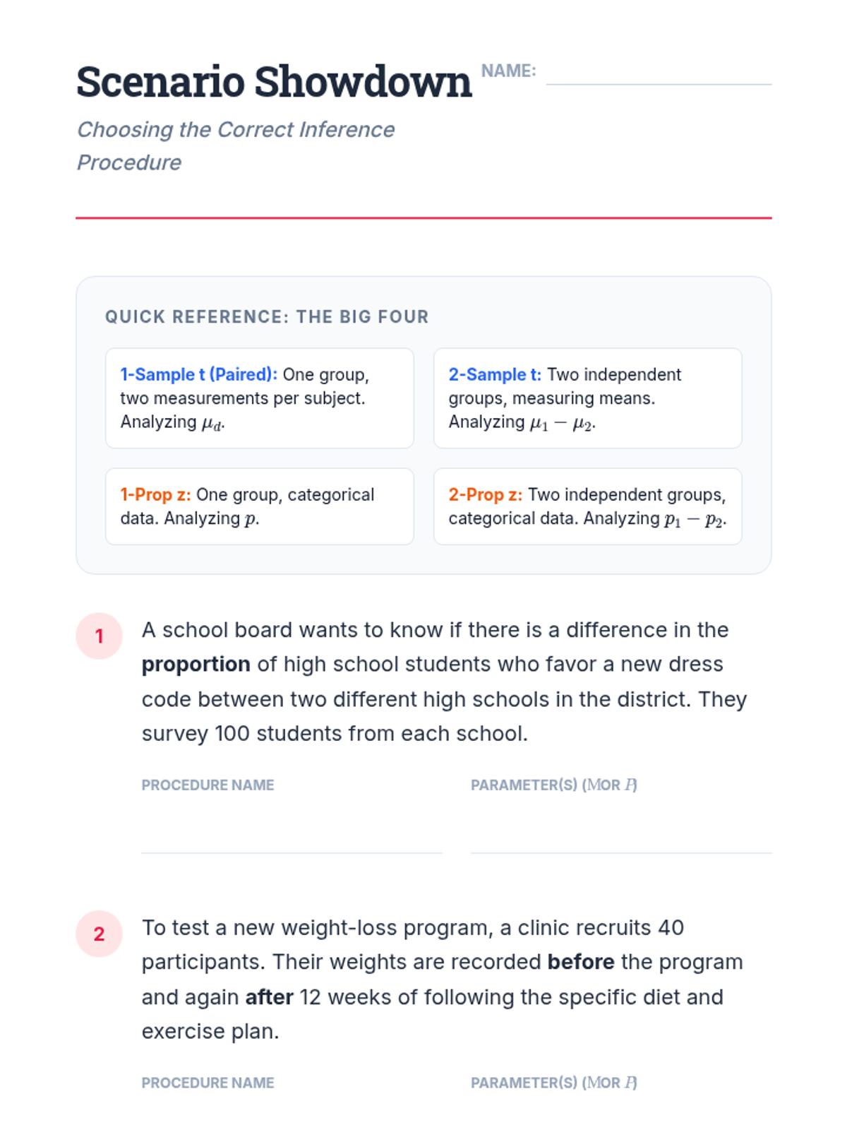 A review lesson where students are presented with mixed scenarios (proportions vs. means, paired vs. independent). They must select the appropriate test and justify their choice, reinforcing the decision-making skills required for the AP exam or real-world analysis.