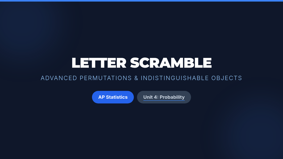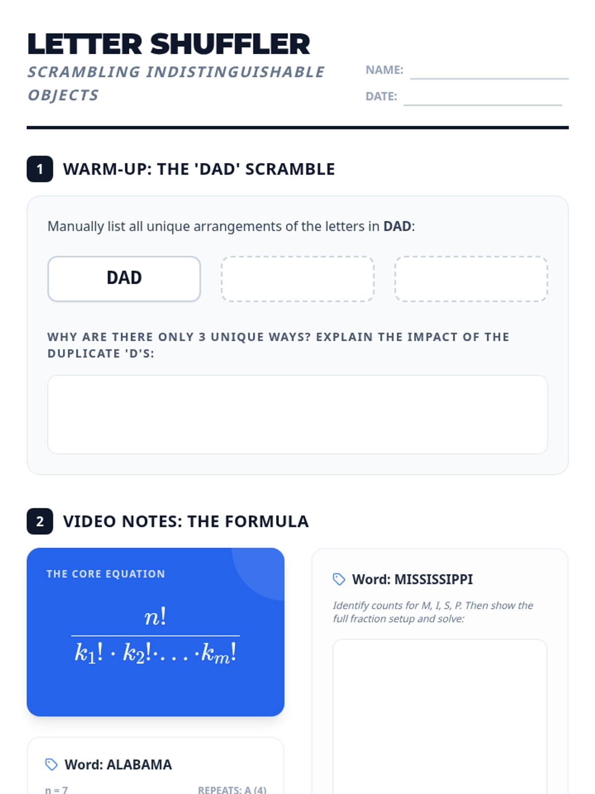 A lesson on calculating permutations with indistinguishable objects, specifically focusing on repeating letters in words. Students will analyze the 'DAD' scramble, watch a tutorial on 'ALABAMA' and 'MISSISSIPPI', and calculate the permutations of their own names.