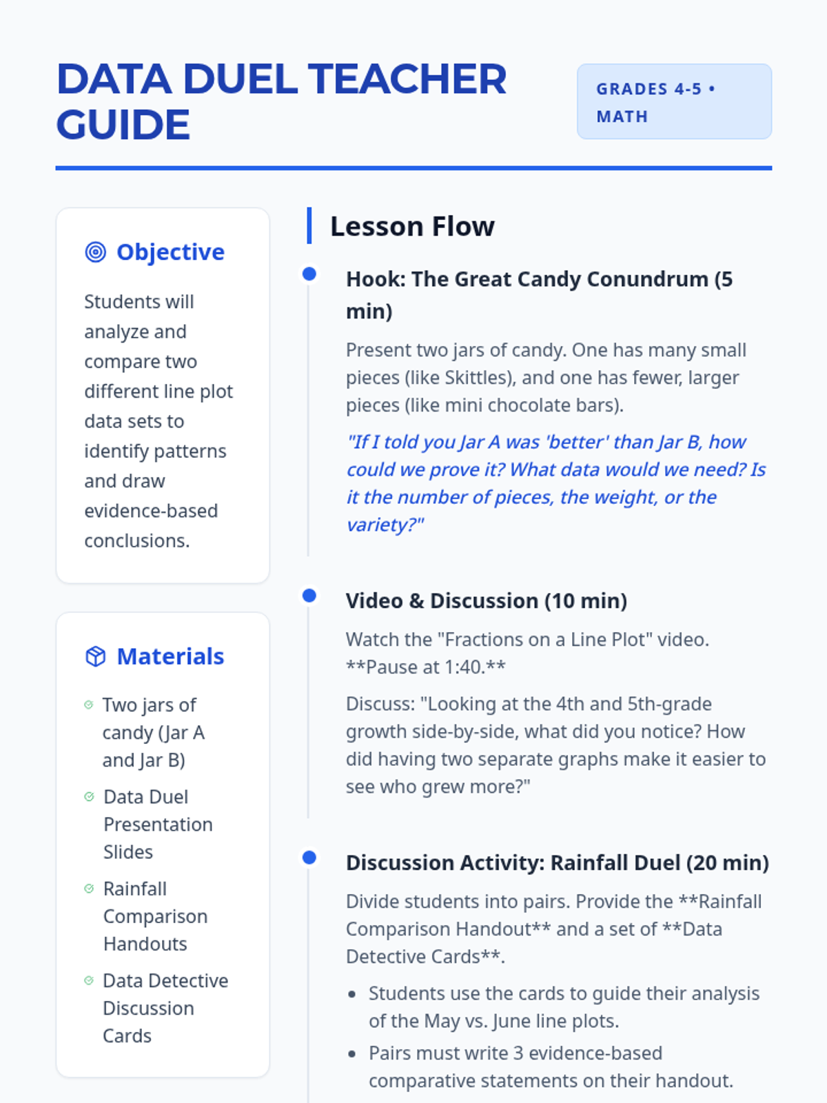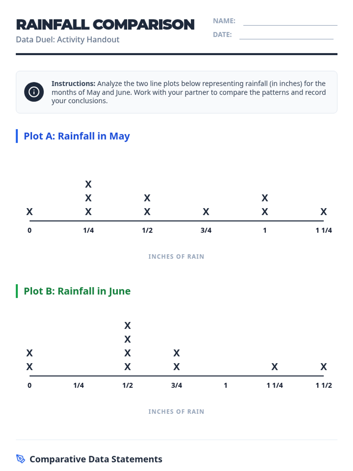 A data analysis lesson where students compare rainfall line plots to draw evidence-based conclusions. Includes a video-guided tutorial on constructing line plots with fractions and a collaborative analysis activity.