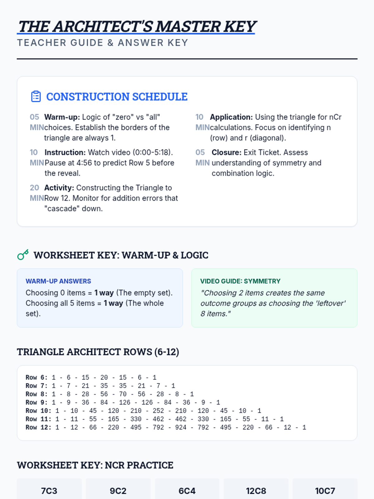 Students will construct Pascal's Triangle and explore the mathematical logic of the symmetry of combinations ($nCr = nC(n-r)$) through visual patterns and algebraic reasoning.