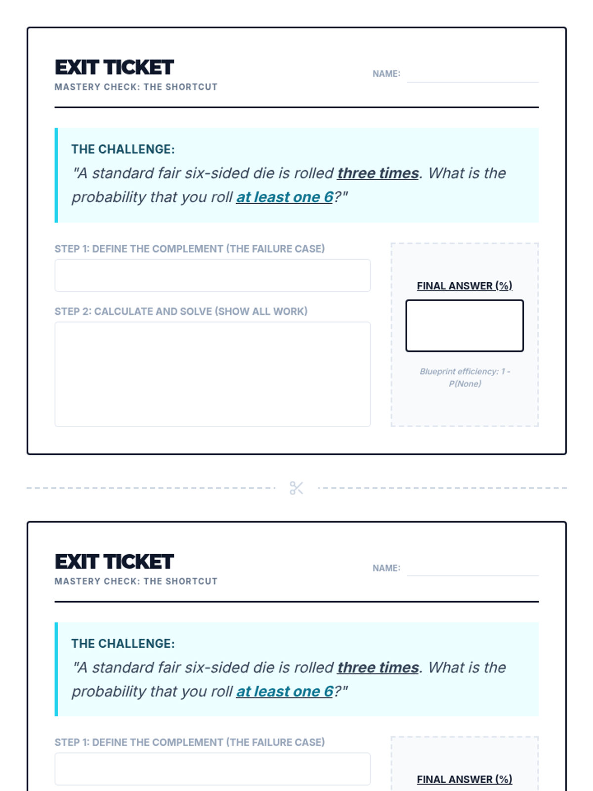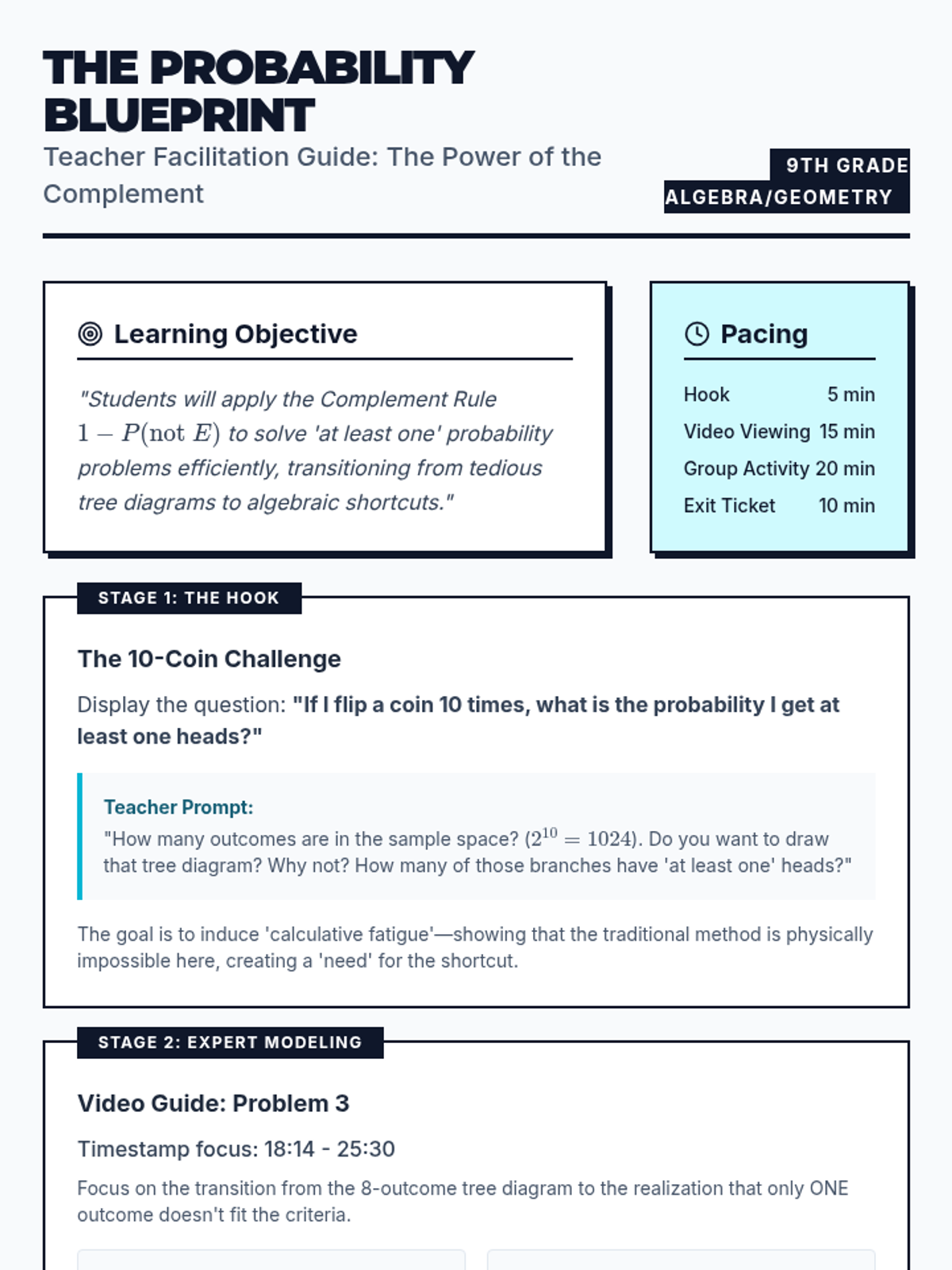 A high-school level lesson focused on the efficiency of the probability complement rule (\(1 - P(\text{not } E)\)) for solving 'at least one' problems in multi-stage experiments.