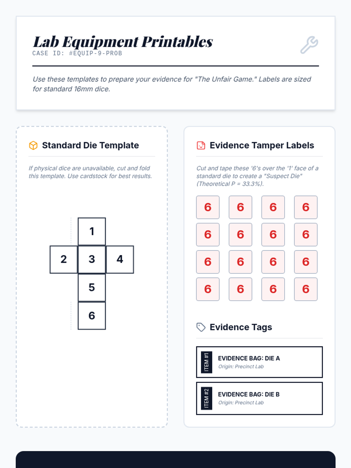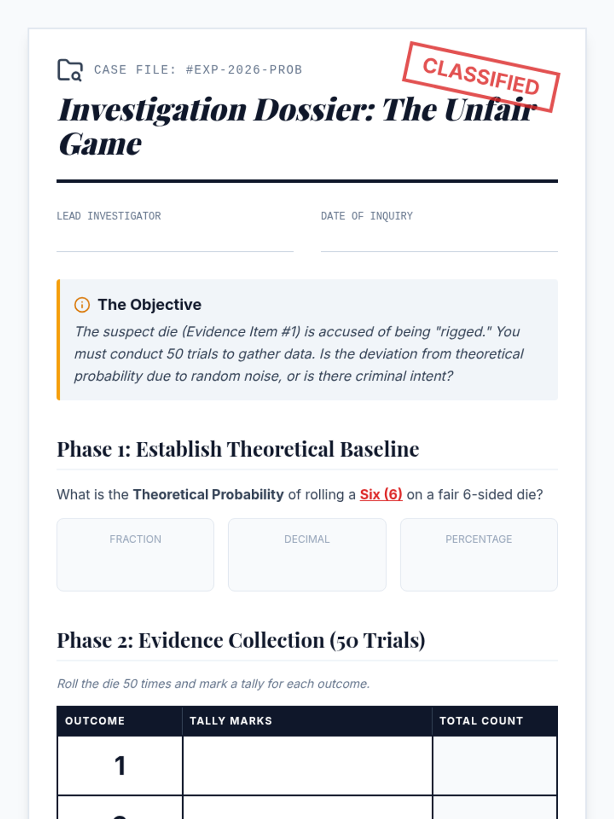 Students investigate the fairness of dice by conducting 50 trials and comparing experimental outcomes to theoretical probability. Using a provided video and data collection sheets, they learn to distinguish between normal statistical variation and evidence of a rigged game.
