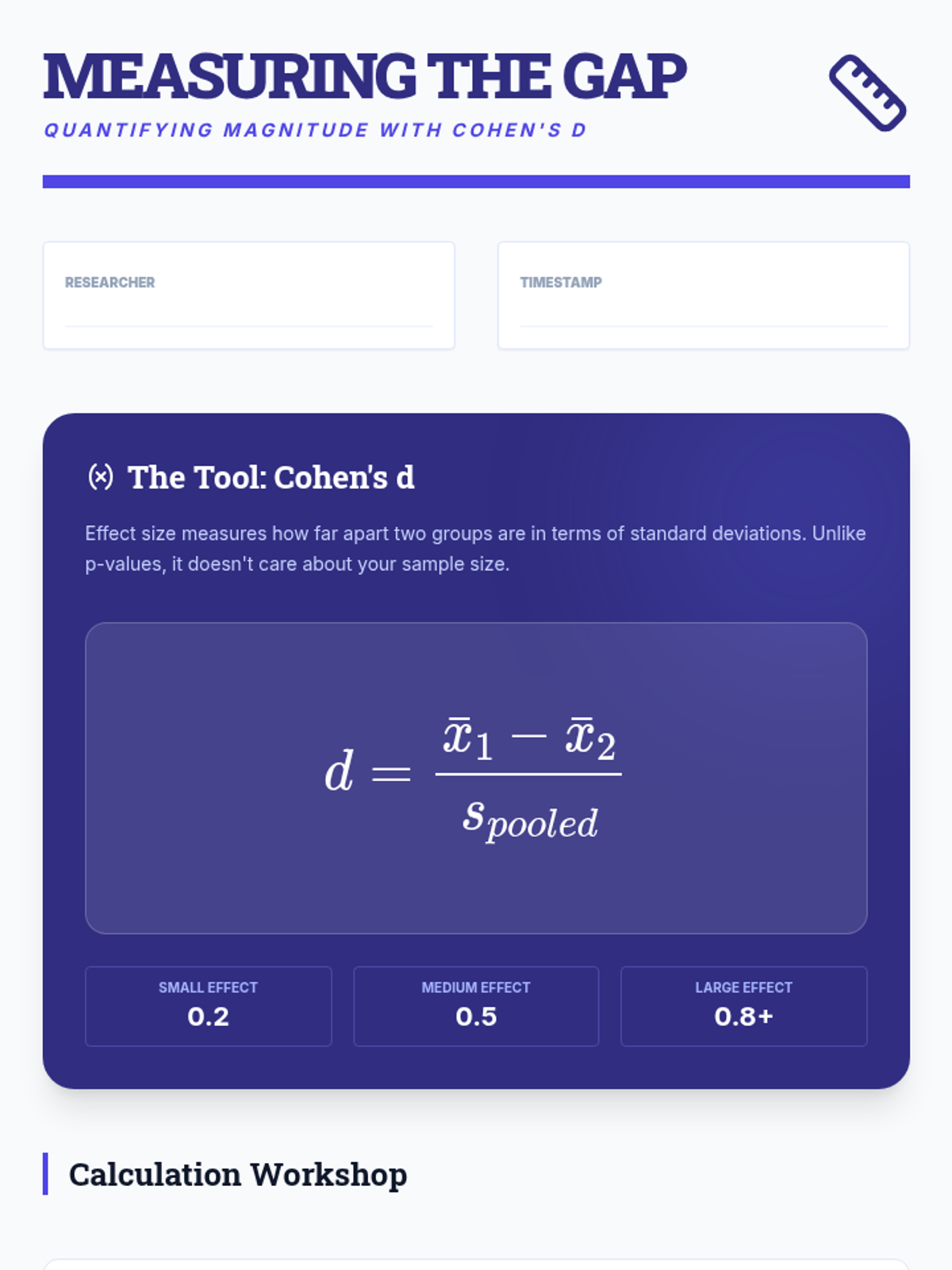 Students learn to calculate and interpret Cohen's d, distinguishing between statistical significance (is there an effect?) and practical importance (how big is the effect?).