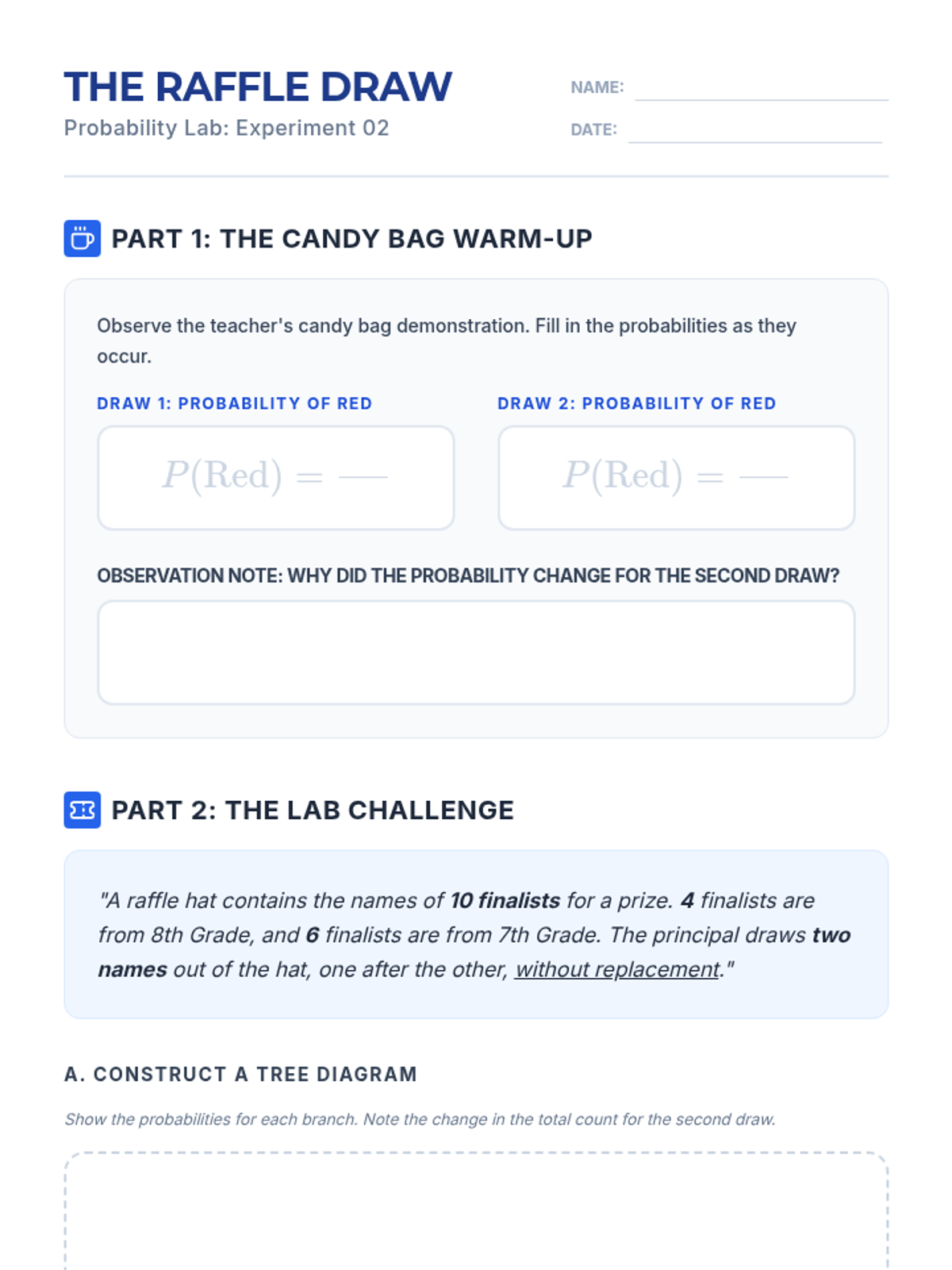 Students will learn to distinguish between independent and dependent events by exploring how probabilities change when items are not replaced, using tree diagrams to visualize outcomes.