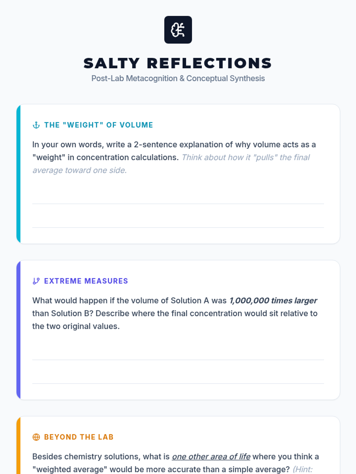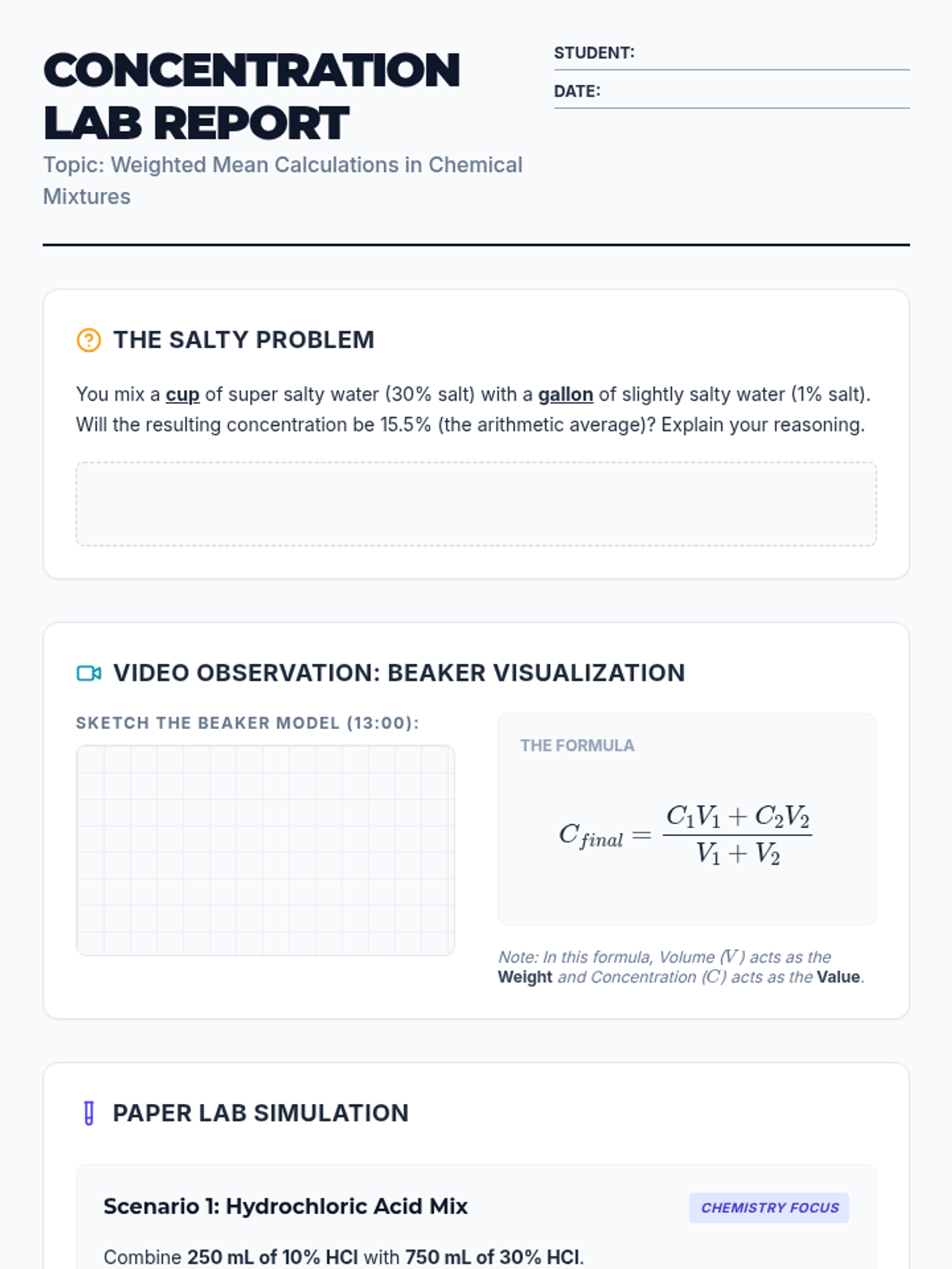 This lesson guides students through the application of the weighted mean formula to determine solution concentrations. It combines visual learning from video demonstrations with a paper-based lab simulation to reinforce the relationship between volume and concentration 'weight'.