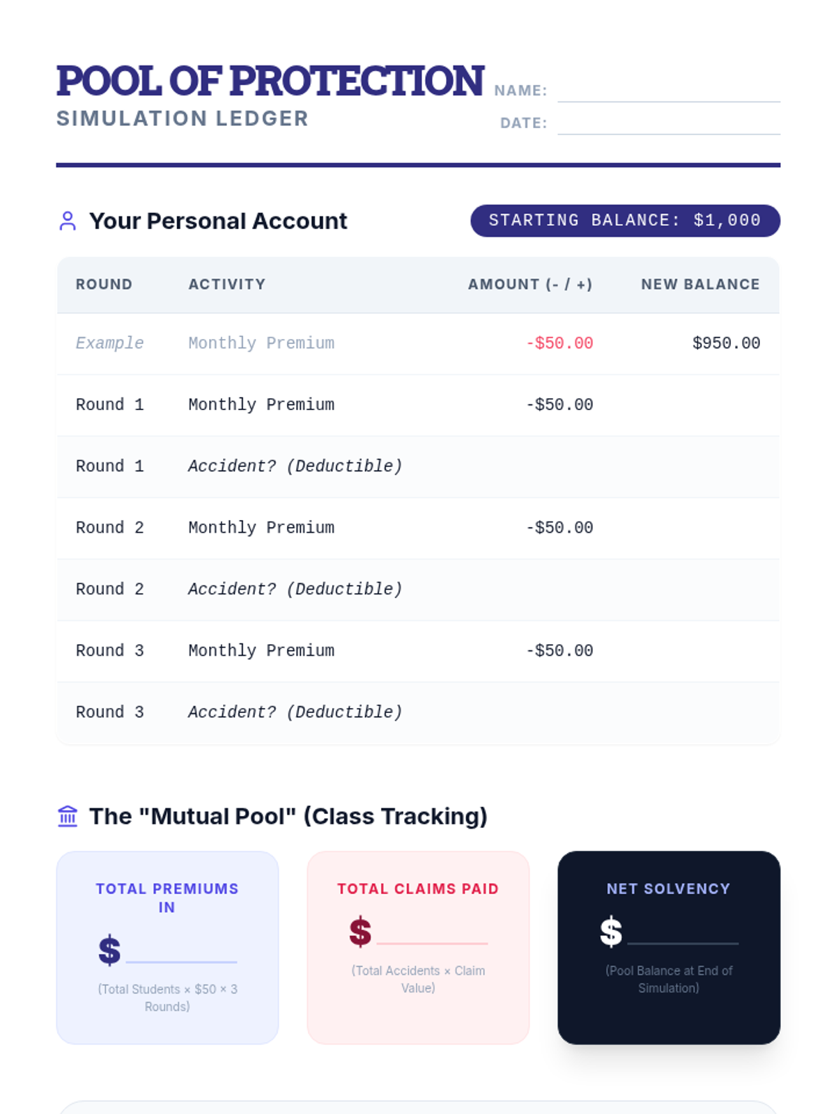 A simulation-based lesson where students act as an insurance company to understand risk pooling, premiums, and the impact of deductibles on solvency.