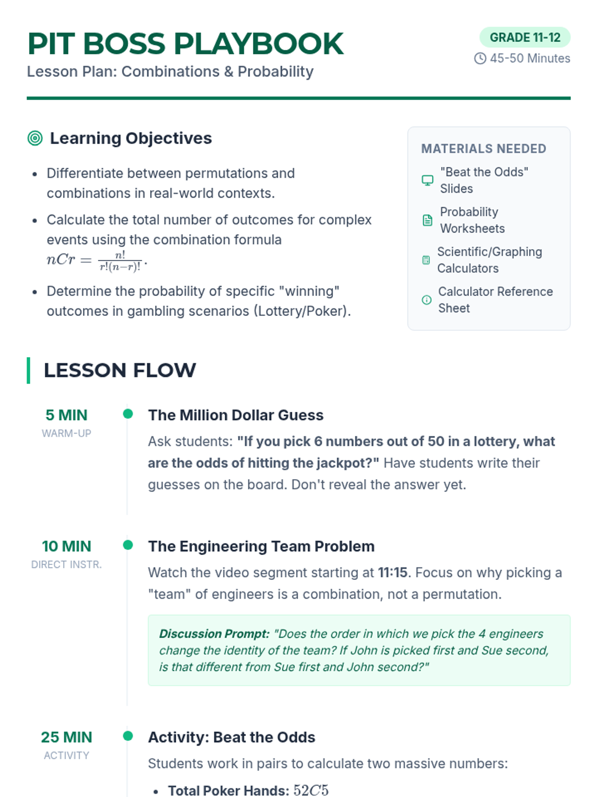 A high school math lesson focused on distinguishing between and calculating permutations and combinations using nPr and nCr formulas. Includes a video-based instruction phase, a collaborative sorting activity, and a creative exit ticket assessment.