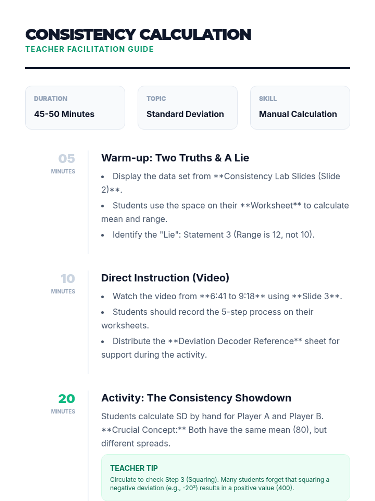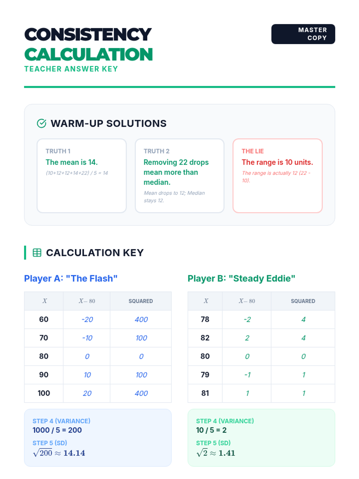 Students will learn to calculate and interpret standard deviation as a measure of consistency. This lesson uses a sports-themed scenario to compare data sets with identical means but different spreads.