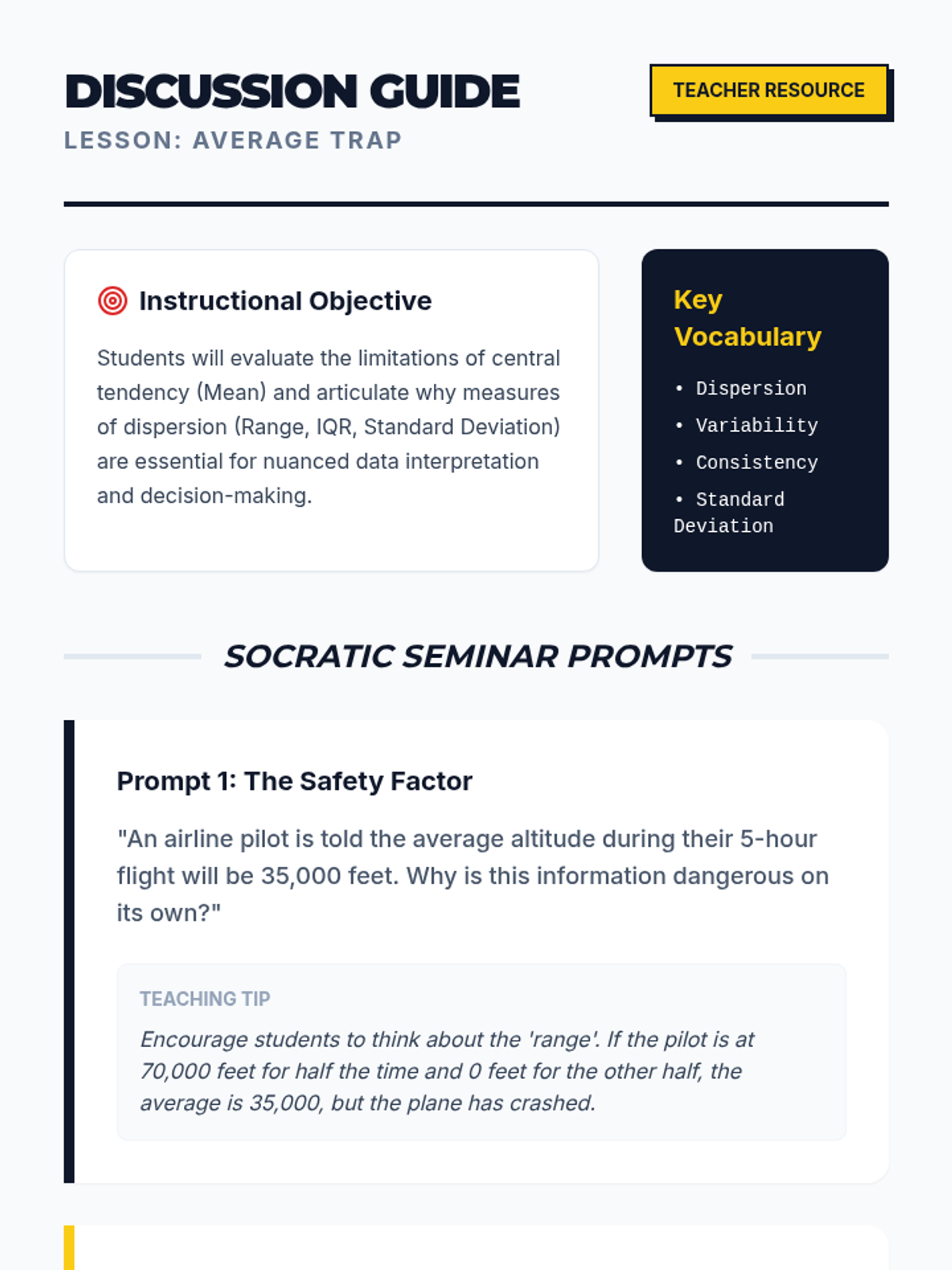 A high school math lesson exploring why central tendency (mean) can be misleading and how measures of dispersion (range, IQR, standard deviation) provide necessary context for decision-making.