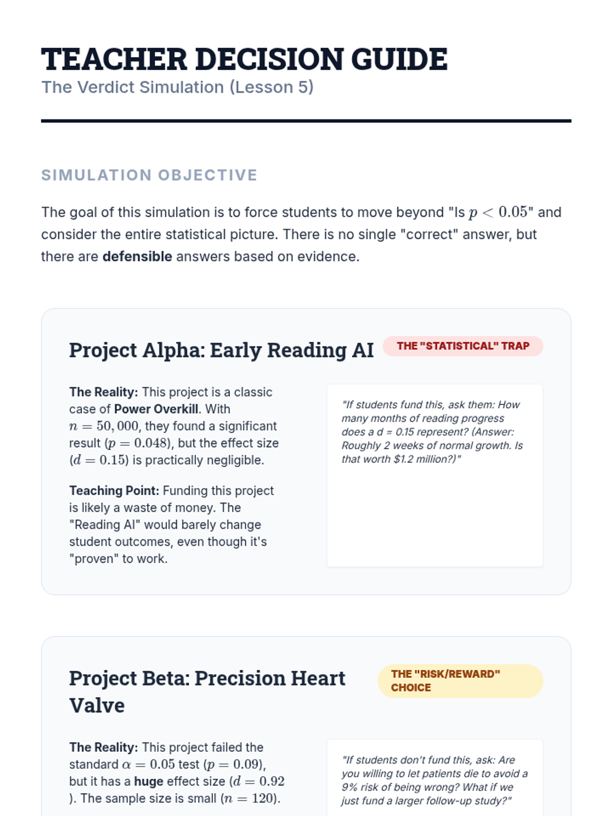 A culminating simulation where students act as a review board, synthesizing p-values, errors, and effect sizes to make evidence-based funding recommendations.