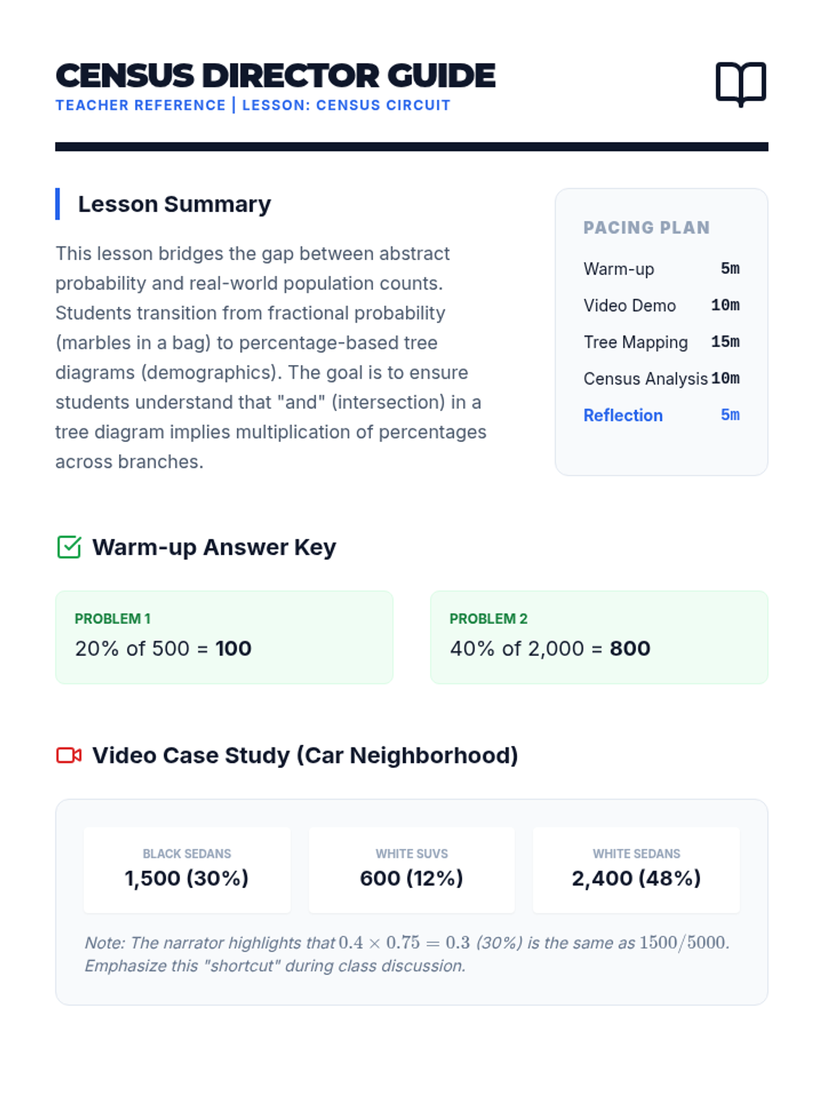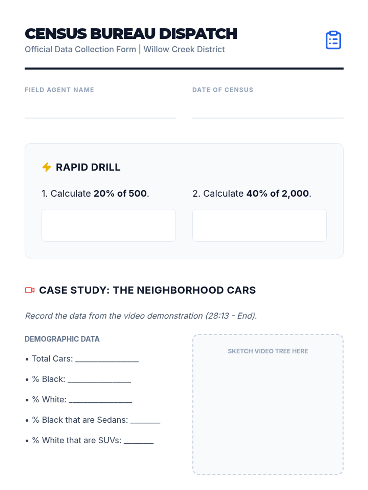 Students learn to construct and interpret probability tree diagrams using percentages and counts, grounded in a real-world census-themed activity. The lesson utilizes a detailed math tutorial video for direct instruction followed by a hands-on data interpretation task.