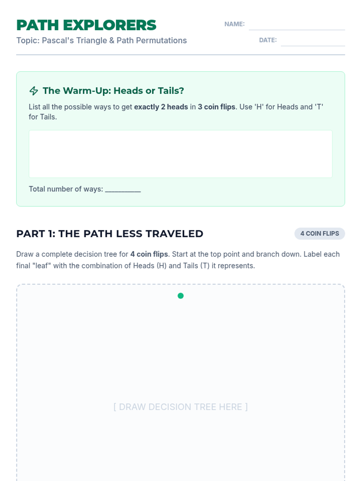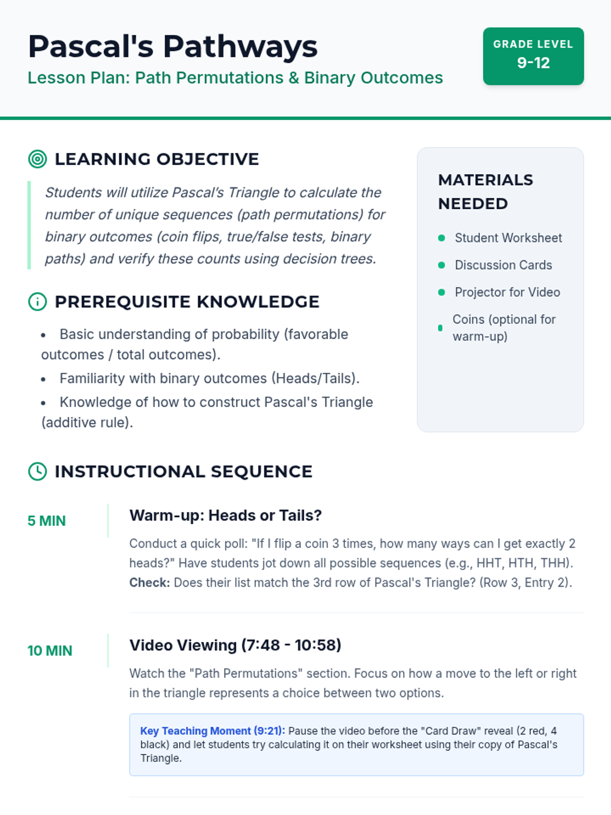 A lesson connecting Pascal's Triangle to probability outcomes and path-finding permutations for high school statistics students.
