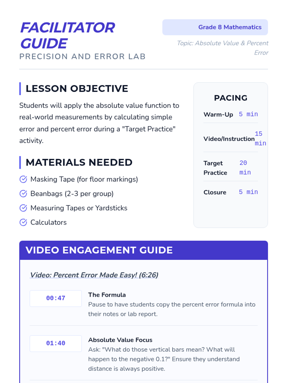 A lesson focusing on the real-world application of absolute value through the lens of scientific error and a hands-on beanbag tossing activity.