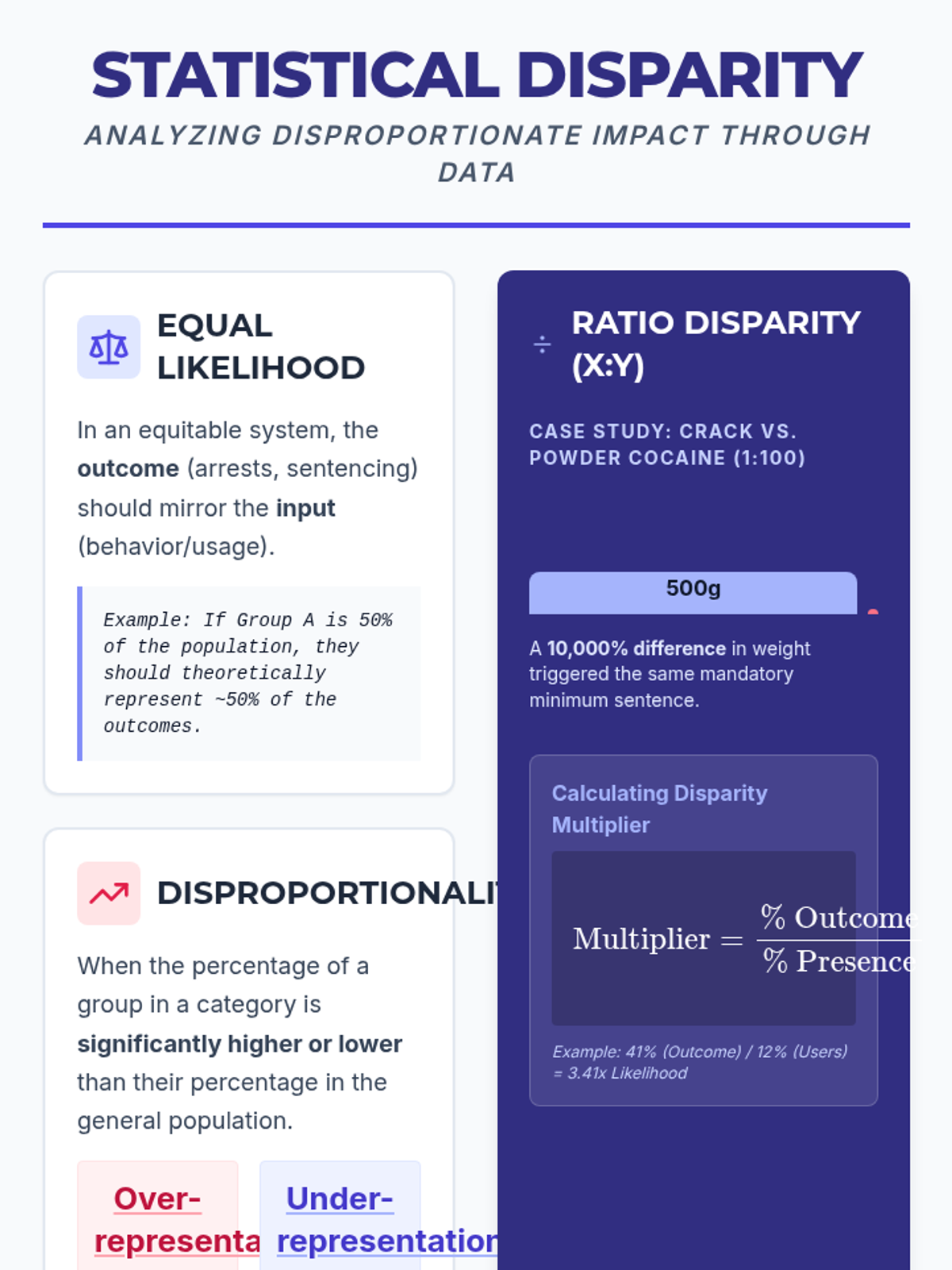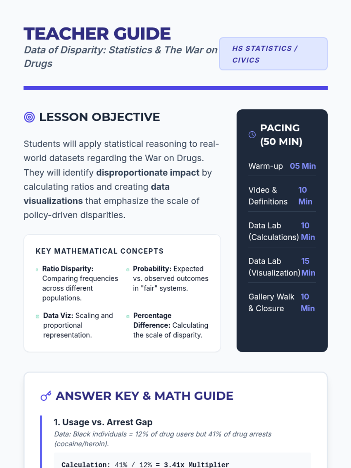 A high school statistics and math lesson that uses data from the War on Drugs to explore disproportionate impact, ratio disparities, and data visualization. Students calculate and visualize significant statistical gaps in drug-related arrests, sentencing, and global incarceration rates.