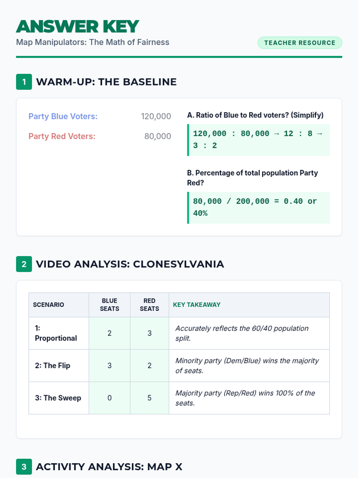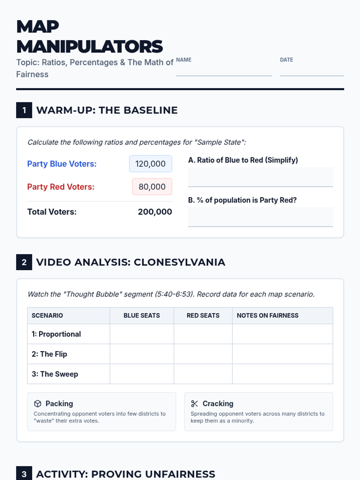 Students apply ratios and percentages to analyze electoral fairness. They will learn to identify 'packing' and 'cracking' strategies and calculate a simplified efficiency gap to mathematically prove gerrymandering in a hypothetical state.