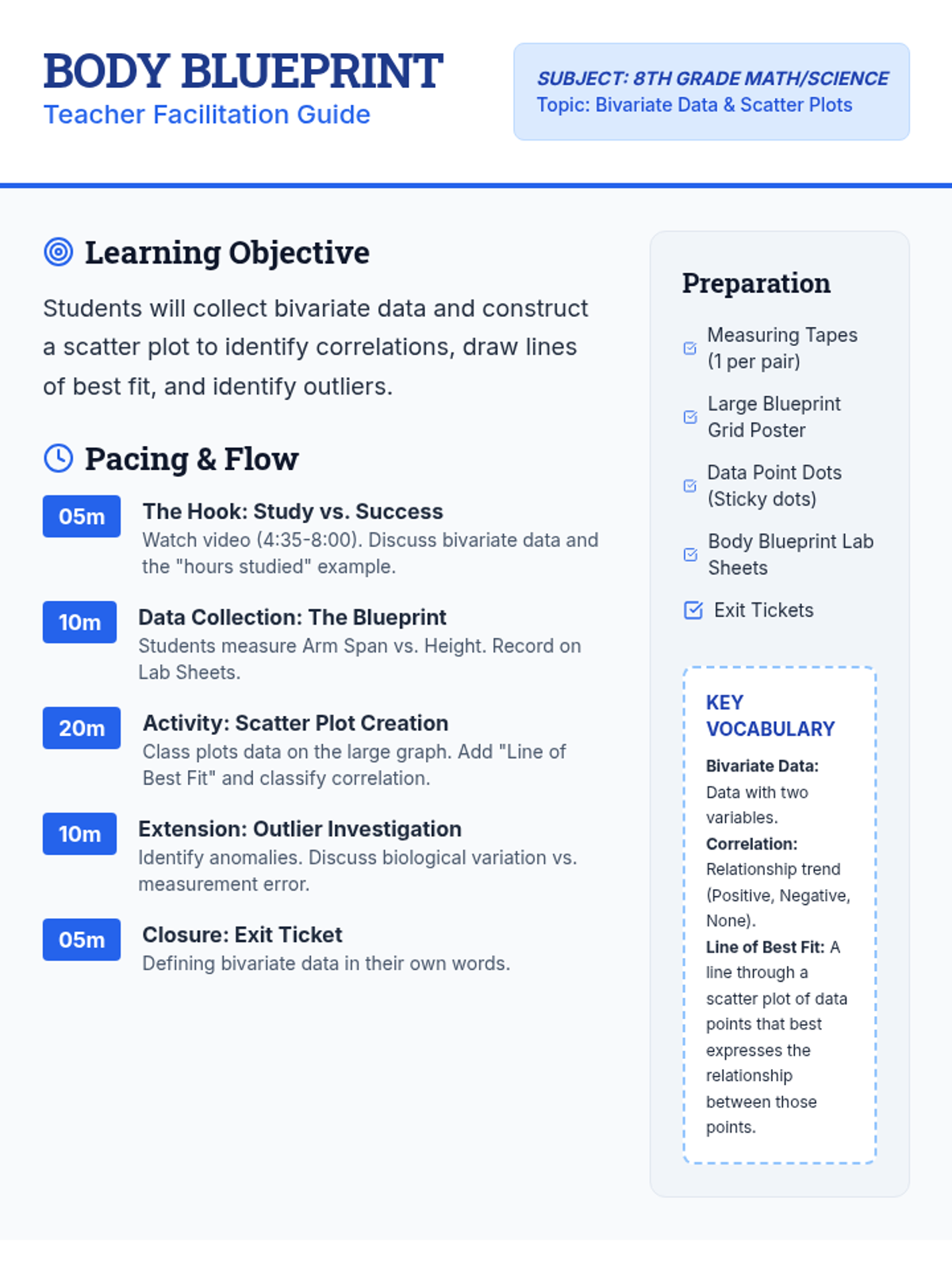 Students explore bivariate data by measuring their own physical proportions, creating a class-wide scatter plot, and identifying correlations and outliers. The lesson includes a video hook, hands-on data collection, and collaborative graphing.