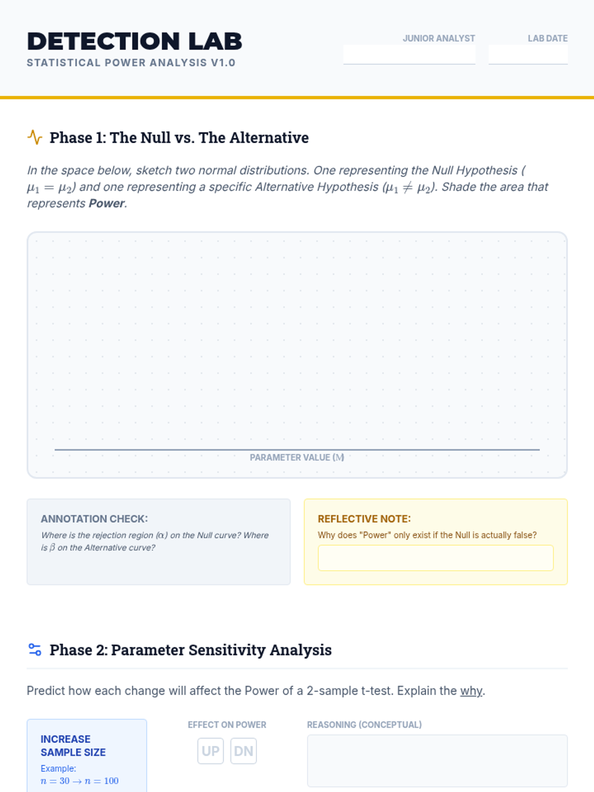 A conceptual exploration of statistical power, investigating how sample size and effect size influence the ability to detect differences.