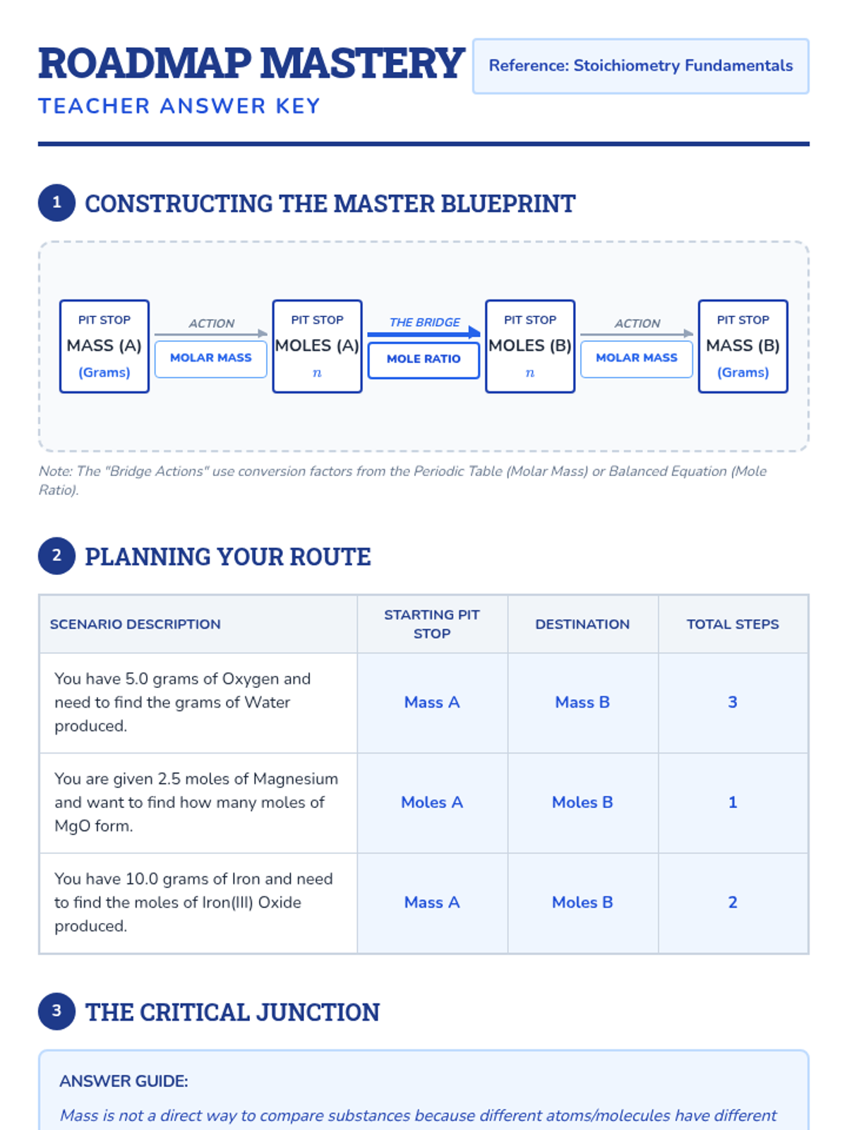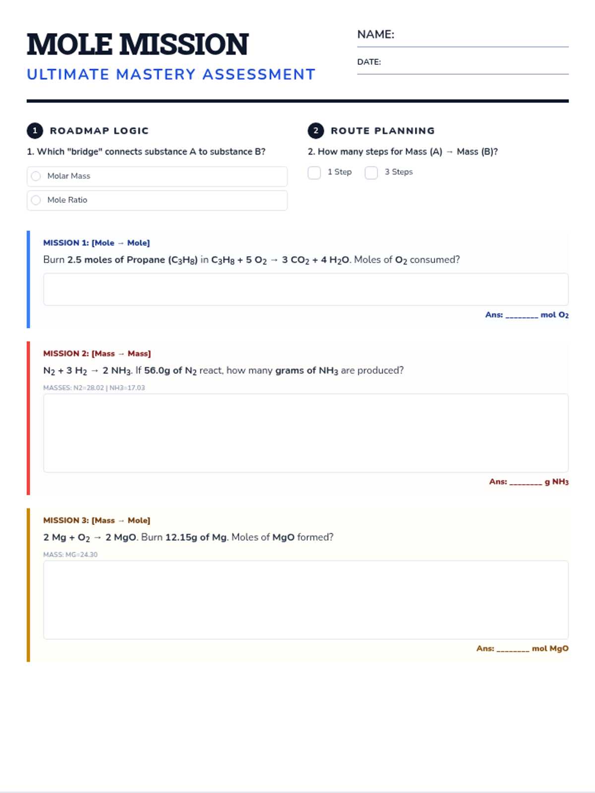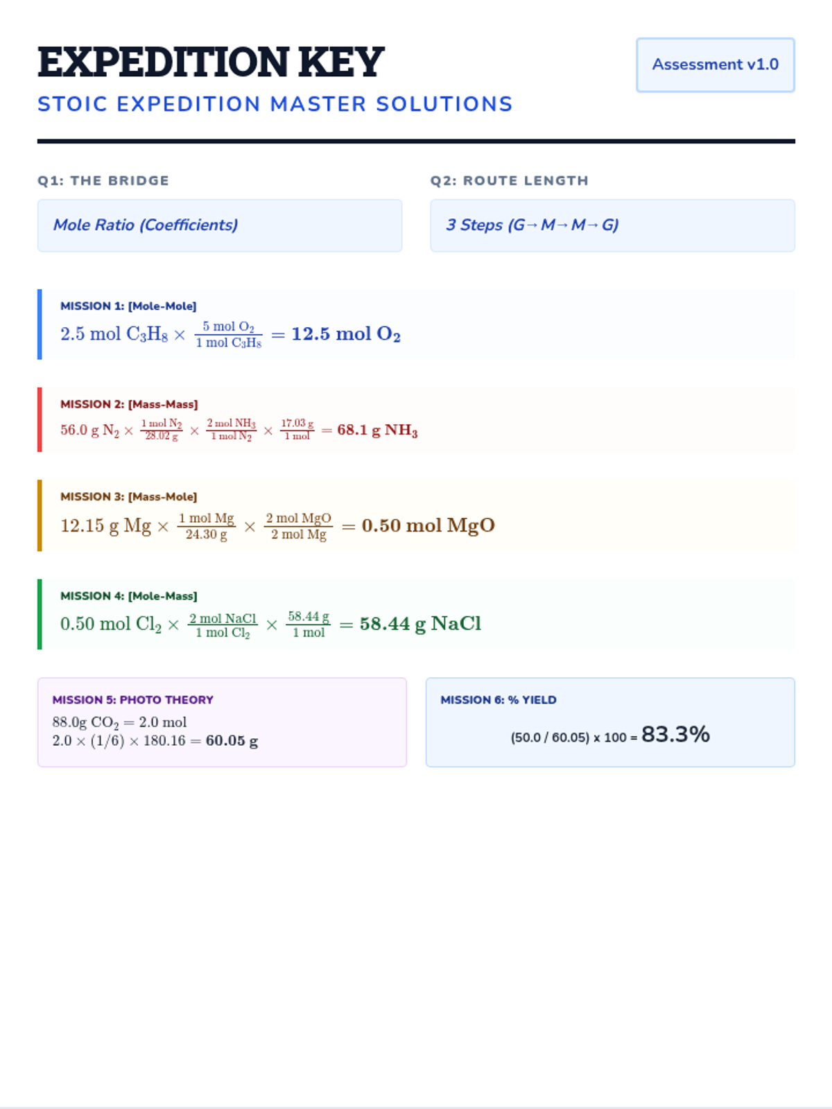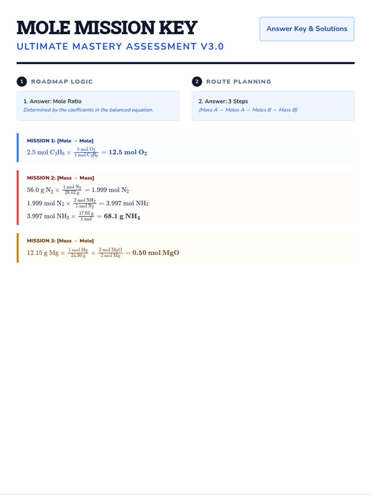 A comprehensive lesson on stoichiometry covering mass conservation, molar conversions, and reaction yields. Includes a visual cheat sheet and a mastery assessment.