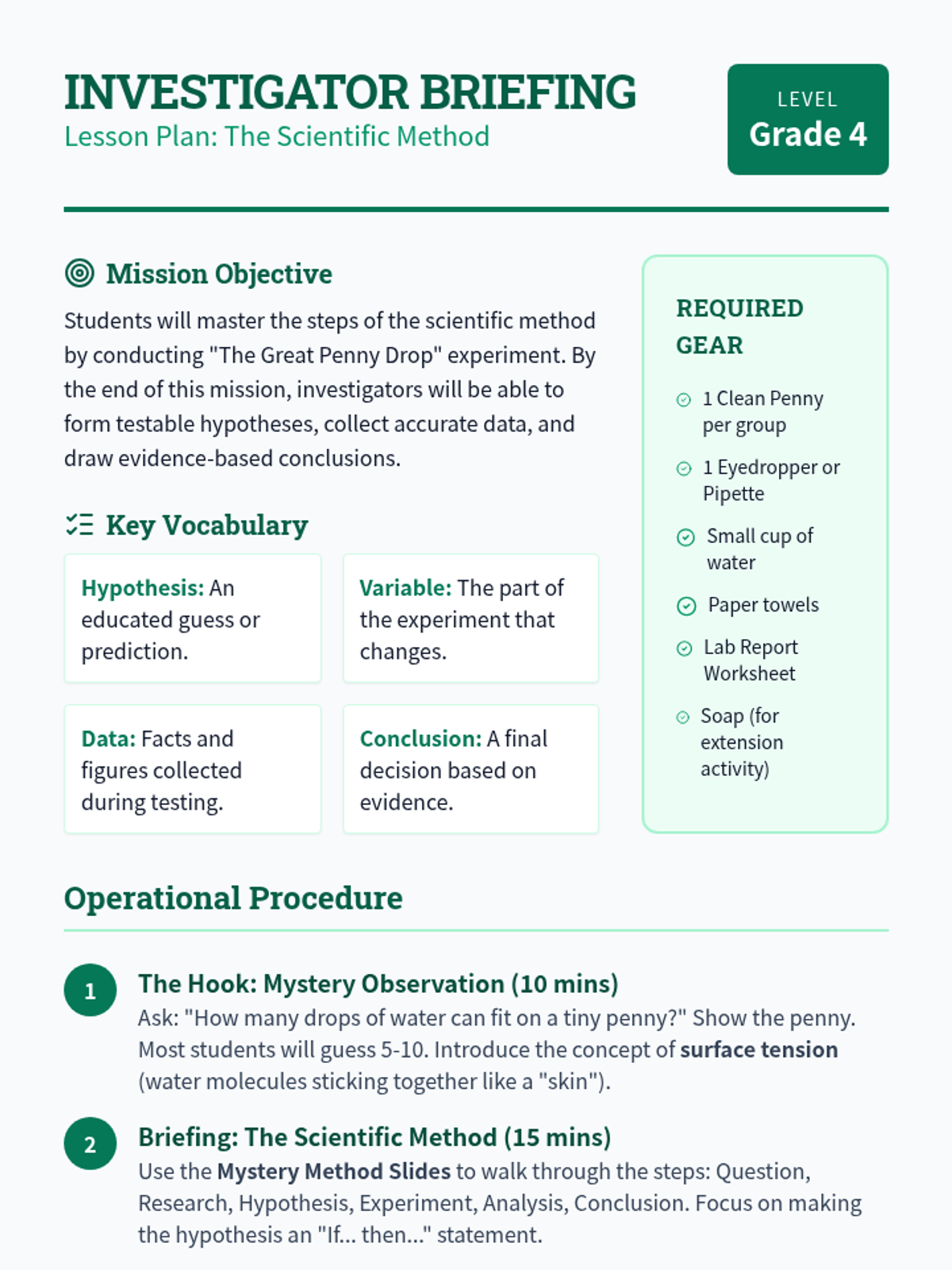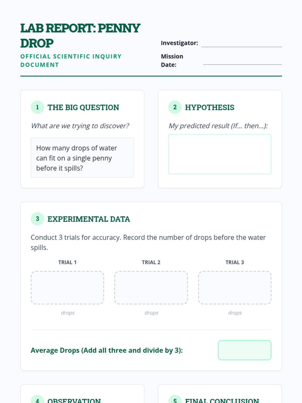A hands-on introduction to the scientific method where students act as lead investigators. They will explore surface tension through the 'Great Penny Drop' experiment while mastering the steps of scientific inquiry.