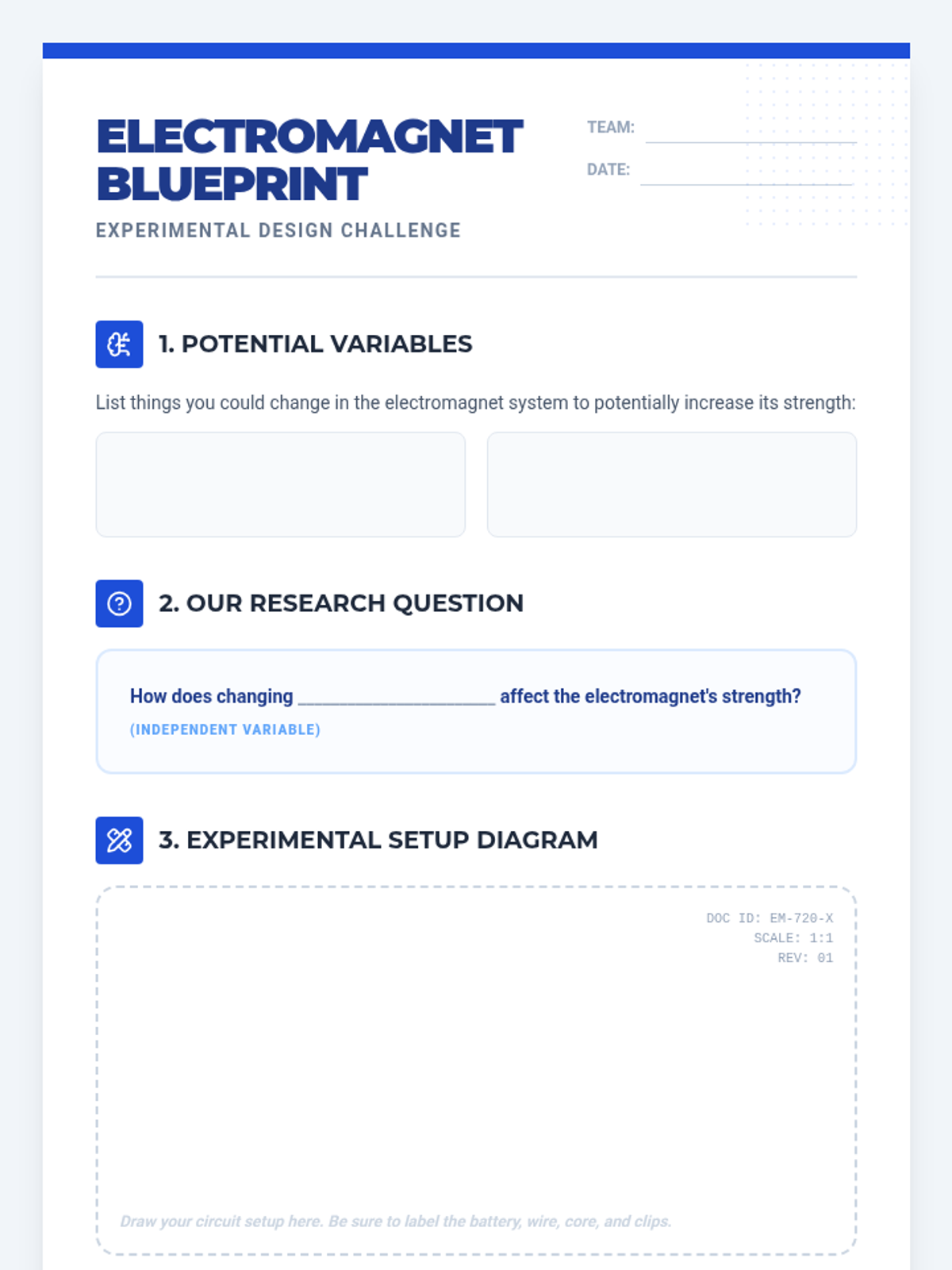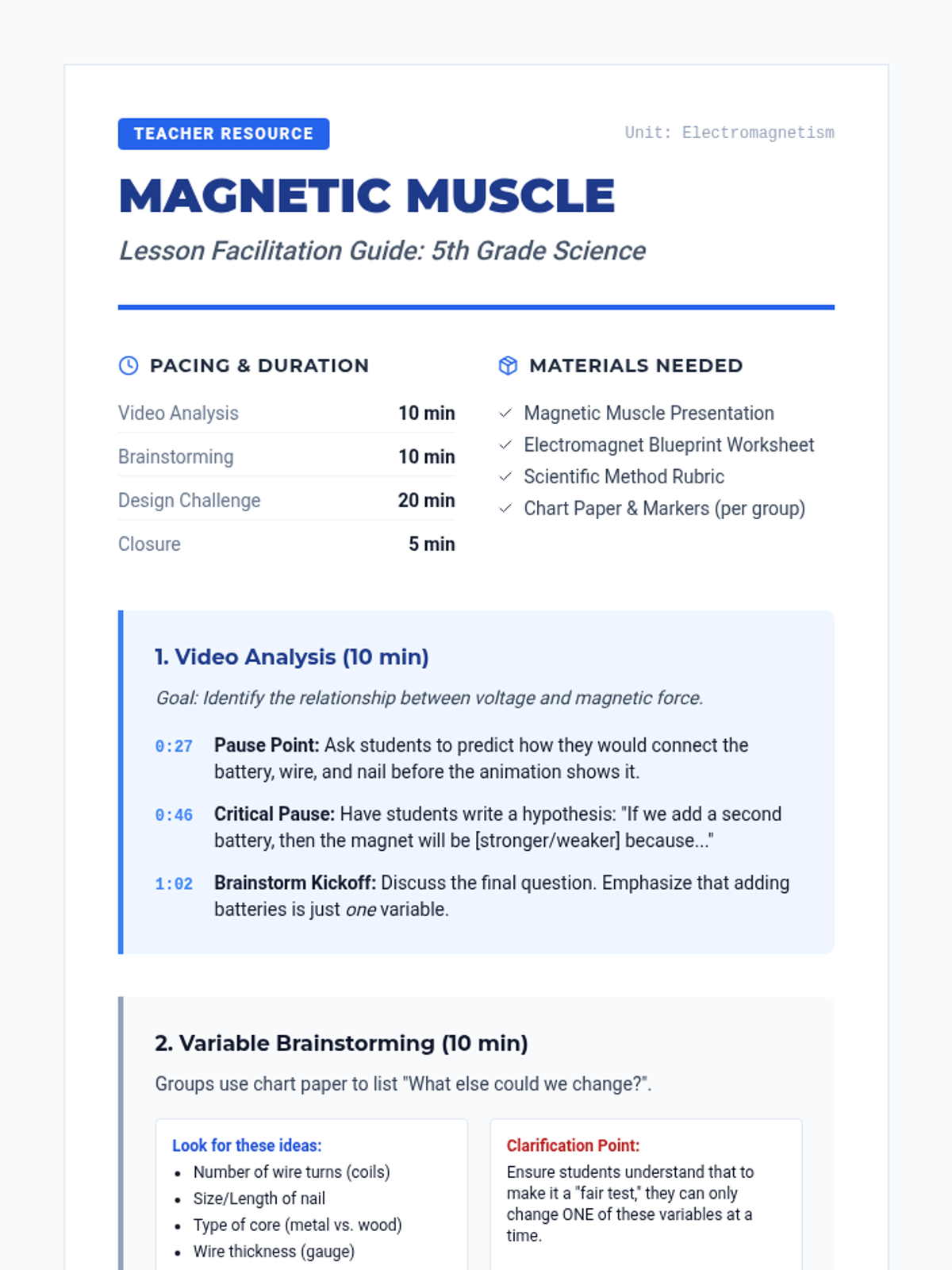 Students investigate the variables that affect the strength of an electromagnet, analyze a demonstration video, and design their own controlled experiment to test a new variable.