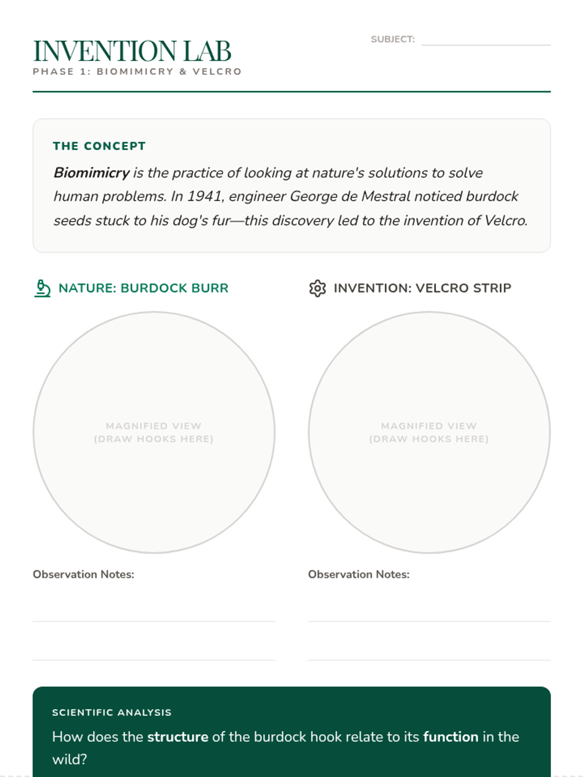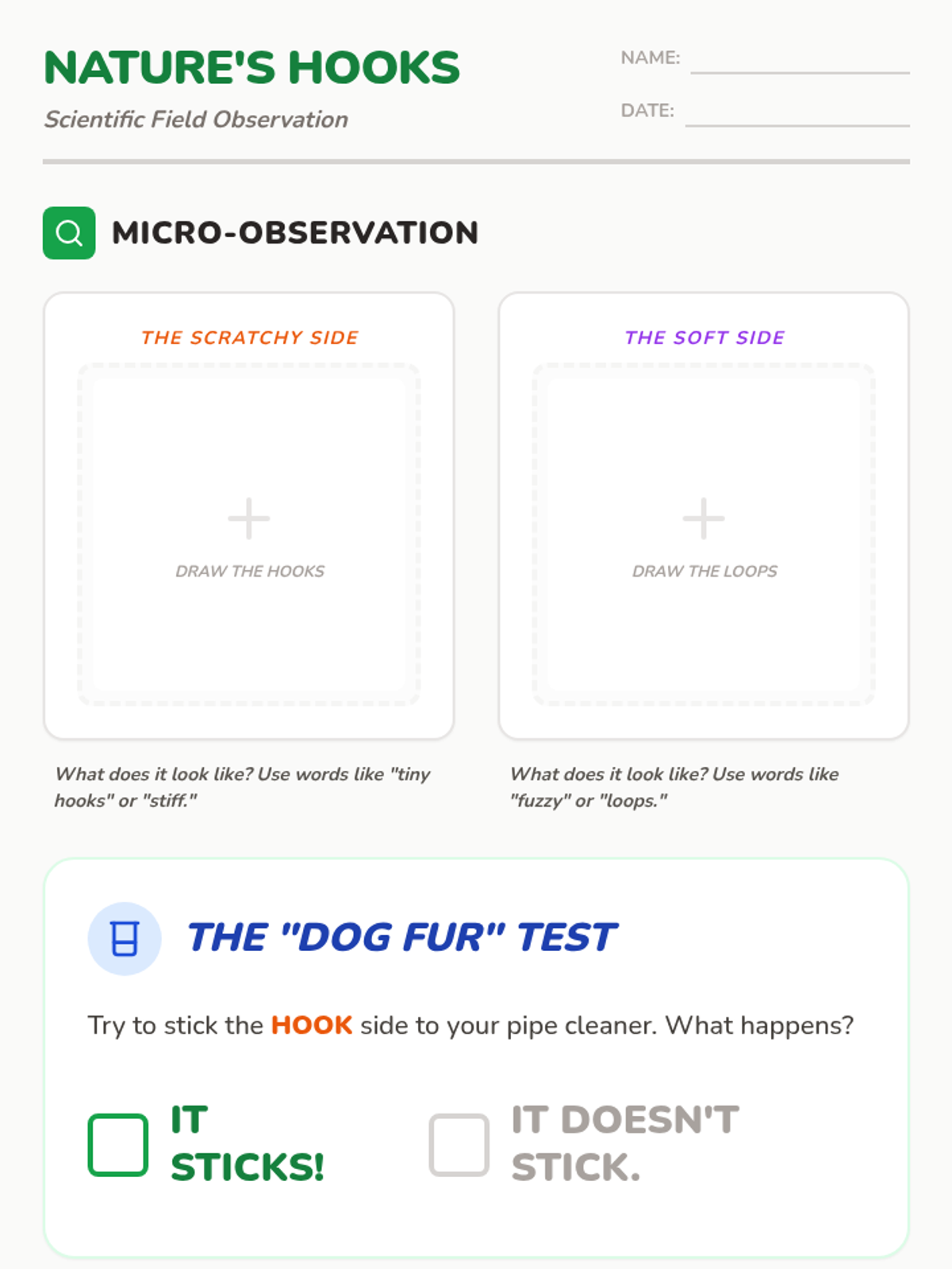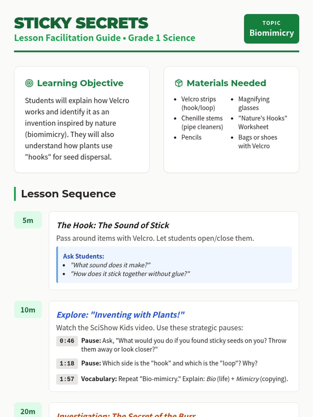 A 1st-grade science lesson exploring how Velcro was inspired by burrs in nature, introducing the concepts of biomimicry and seed dispersal through hands-on investigation.