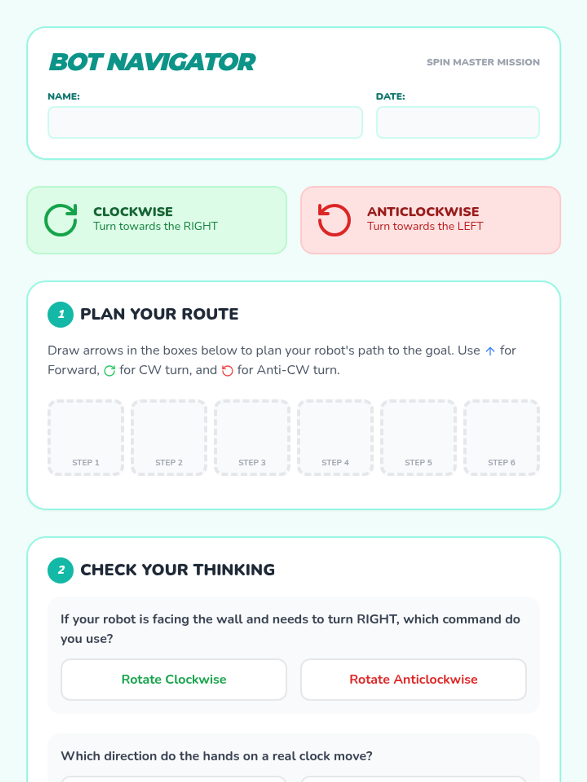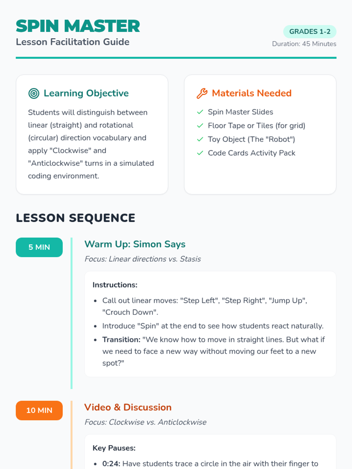 A fun, hands-on introduction to rotational direction where students learn to distinguish between linear movement and turning clockwise or anticlockwise through a physical coding challenge.