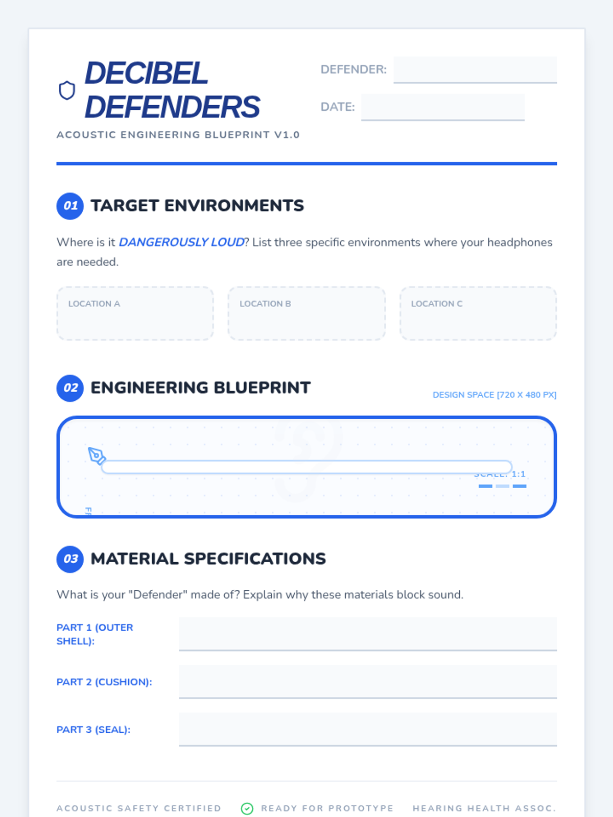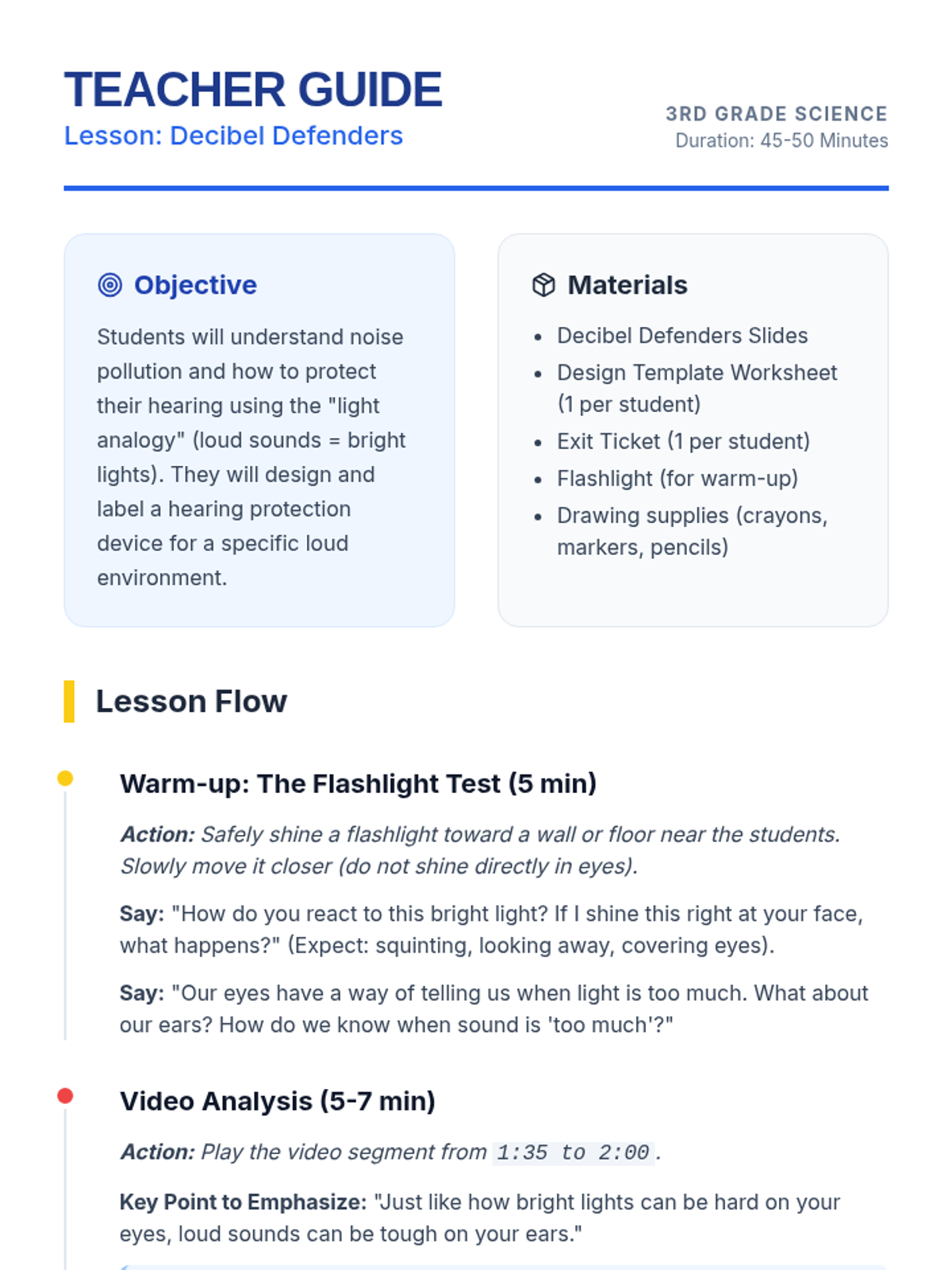 A 3rd-grade lesson exploring noise pollution and hearing protection through the analogy of bright lights, featuring a hands-on 'Decibel Defenders' design activity and a video analysis.