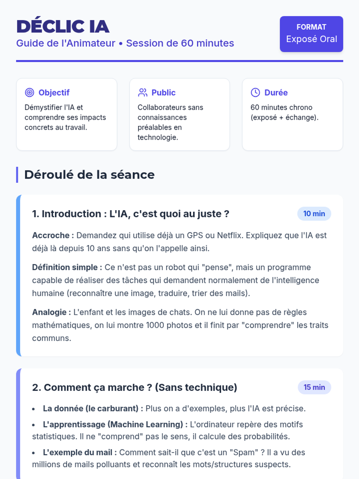 Une séance complète d'une heure pour démystifier l'intelligence artificielle auprès de collègues, couvrant les bases, les usages pratiques et les enjeux éthiques.